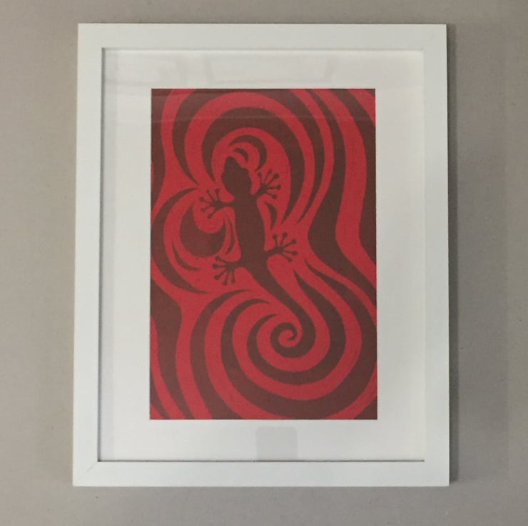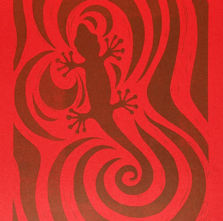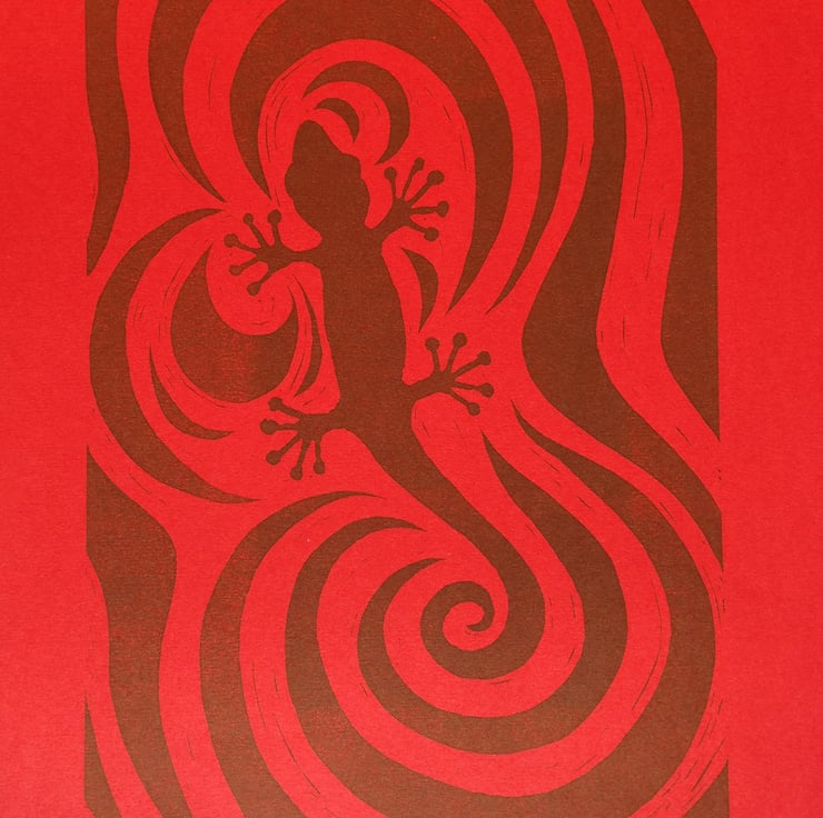 This lino print was inspired by many trips to the zoo and my fascination with the reptile house. I love the shape of the lizard and the fact that it can camouflage with its surroundings. I used swirls in the background of this print to echo the swirl of the lizards tail and chose to print the whole piece in the same colour so the lizard is camouflaged with the background.