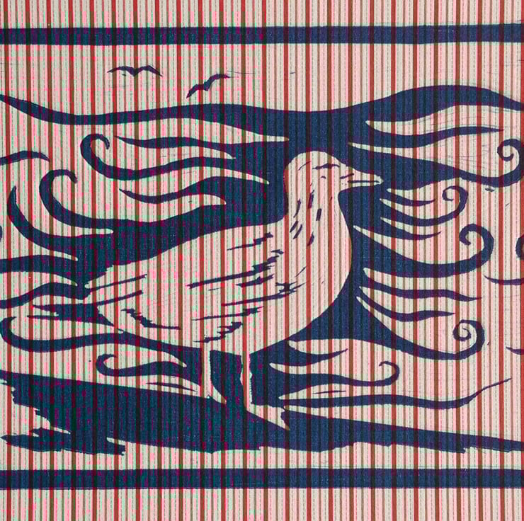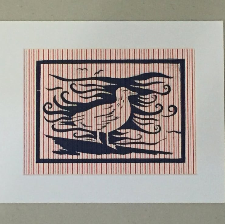 This lino print was inspired by my love of the seaside and regular trips to the coast. The sea gull is an emblem of the seaside and the swirling sea behind completes the picture. I have printed onto stripy paper, which reminds me of the Punch and Judy tent, deckchairs, sticks of rock and many things associated with the seaside.