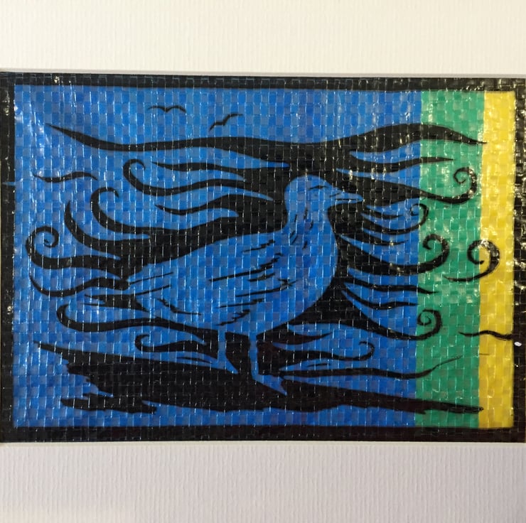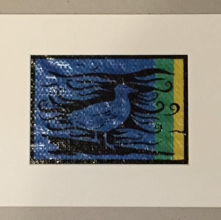 This lino print was inspired by my love of the seaside and regular trips to the coast. The sea gull is an emblem of the seaside and the swirling sea behind completes the picture. I have printed directly onto a piece of wind break for its great texture and as another, colourful, reminder of those seaside holidays.