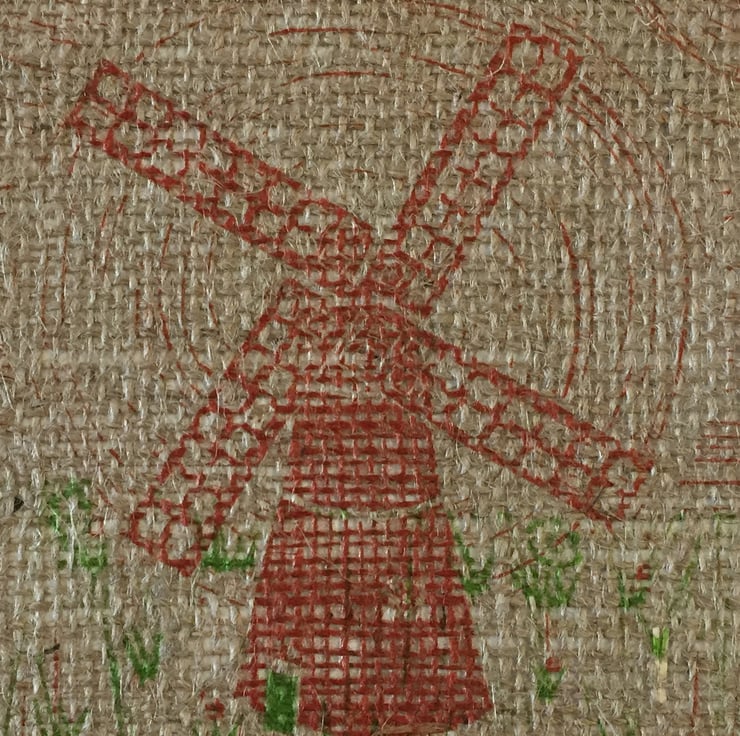 This print was inspired primarily by old flour sacks and retro advertising. The windmill relates to how the flour was made. The colours are taken from those popular in retro advertising and they were also used to decorate old flour sacks. The hessian used to print on is inspired directly by the flour sack itself and gives texture to the work. I enjoyed telling the story of the windmill in this print, creating movement with circular lines around the sails, contrasting with the relative stillness of the grass below.