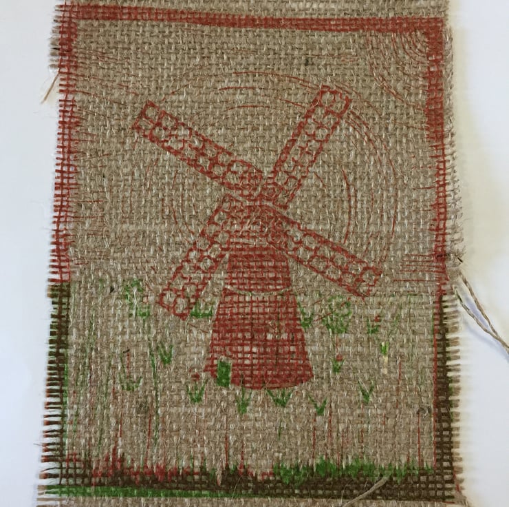 The image itself measures 175x142mm. It is printed on to a piece of hessian measuring 207x145mm. It is worth noting that there is hardly any border around the edge of the image and that the small border is uneven.