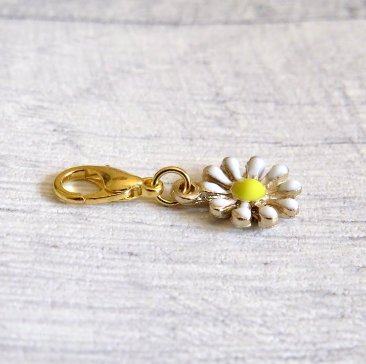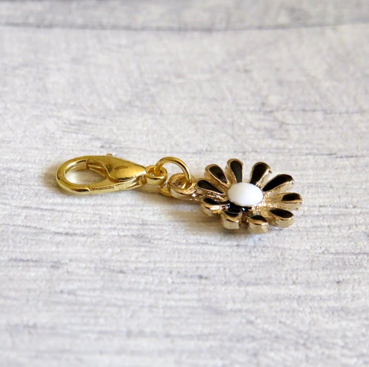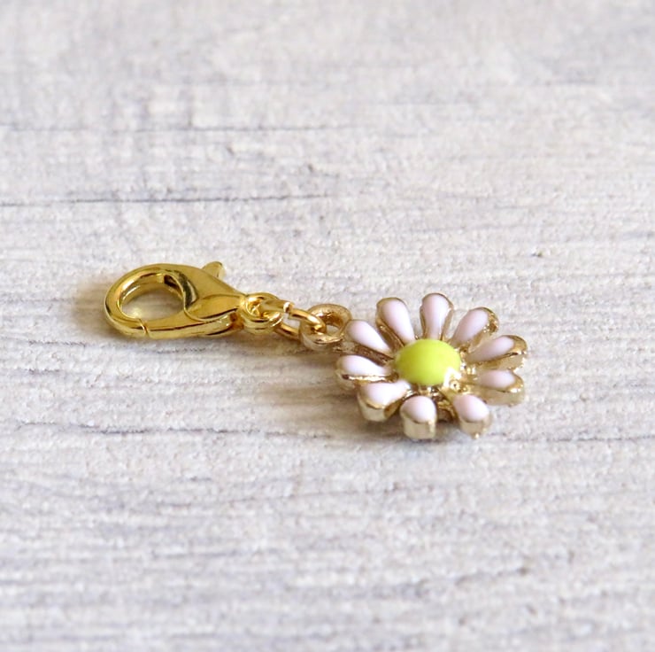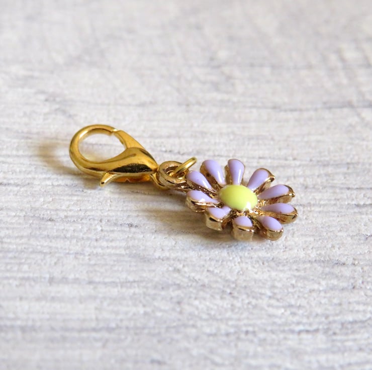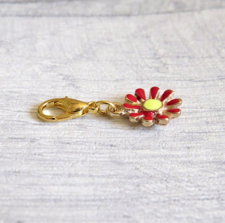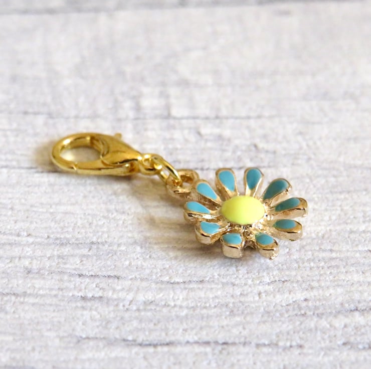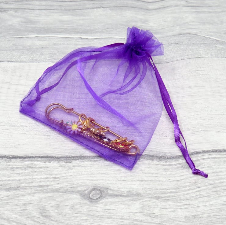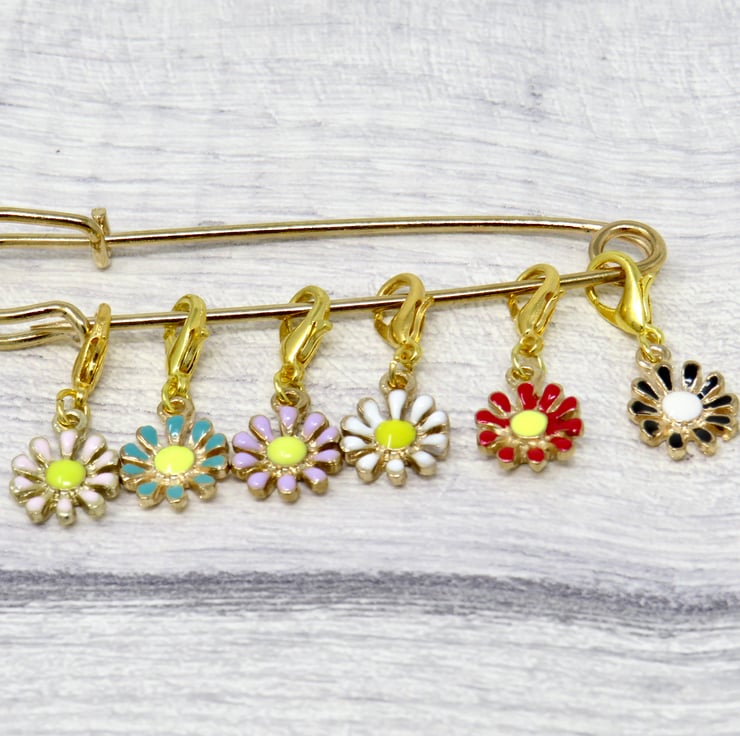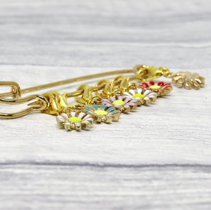 A set of 6 enamel flower charm stitch markers for knitting or crochet. The six charms are all different colours, have lobster clasps and are 2.5 cm long. They come with a large kilt pin to keep them all together and are presented in a pretty organza bag (colours may vary).