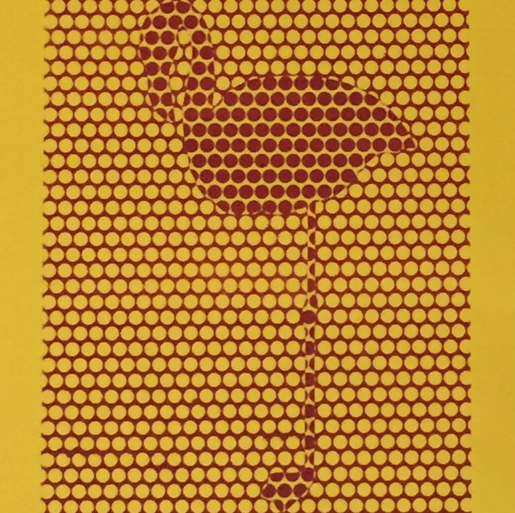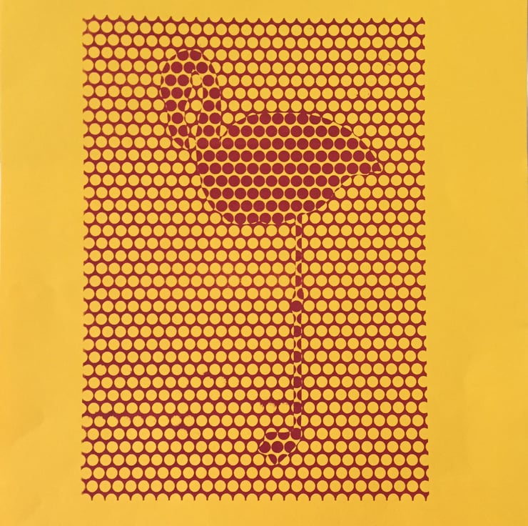 This lino print was inspired by many visits to the zoo and seeing these curious bright pink birds. I also love pop art and wanted to create something in homage to pop! That led me to create an image entirely from dots, using a very limited palette of two colours.