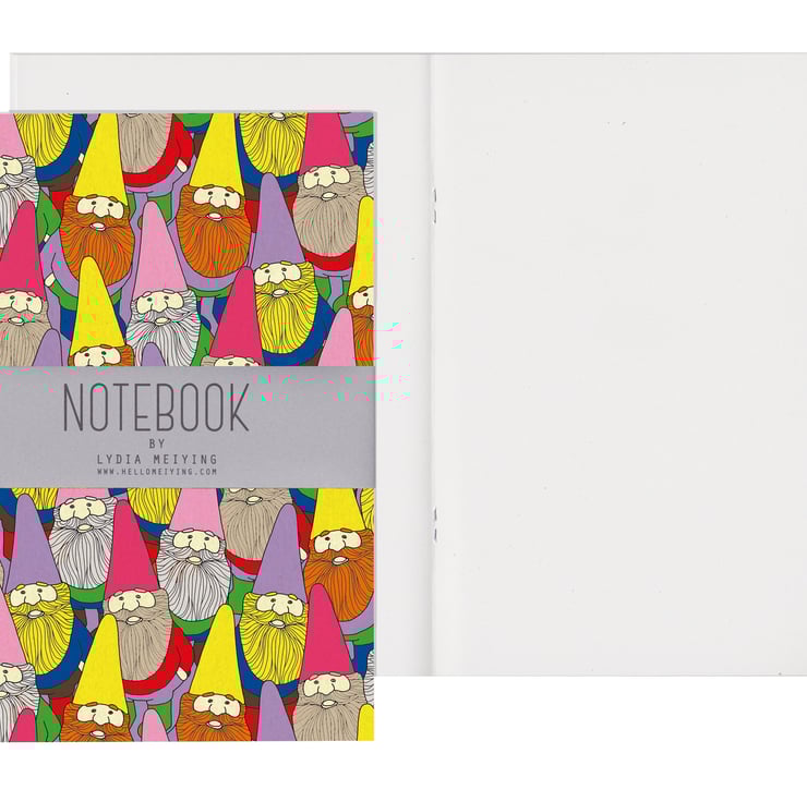 An A5 notebook with plain pages. The cover features a hand drawn pattern of Mister Gnome and friends.