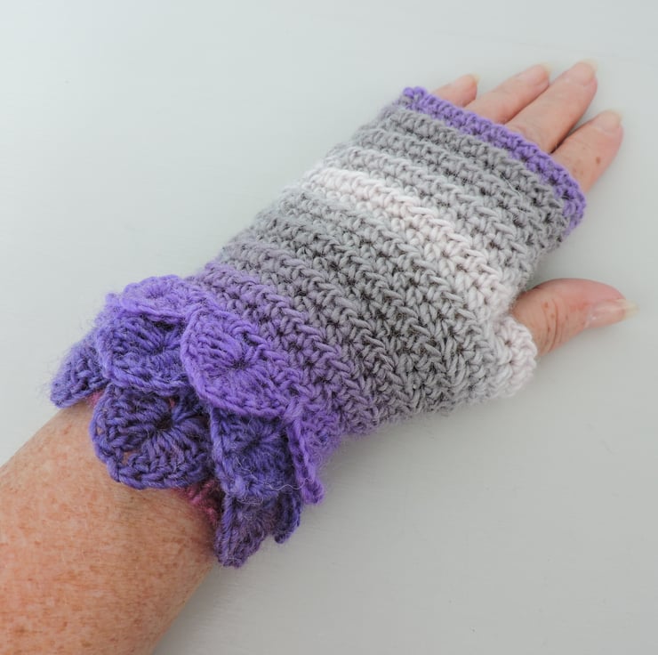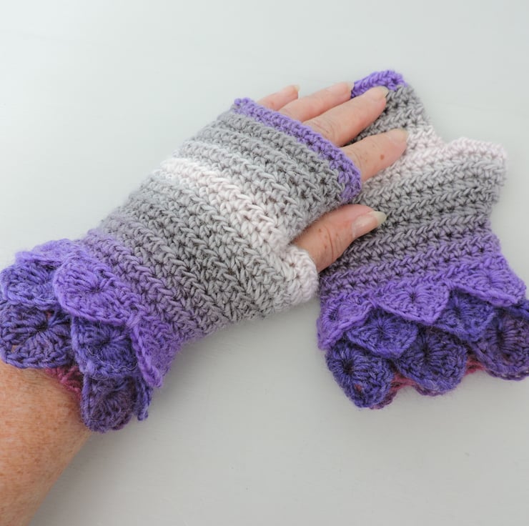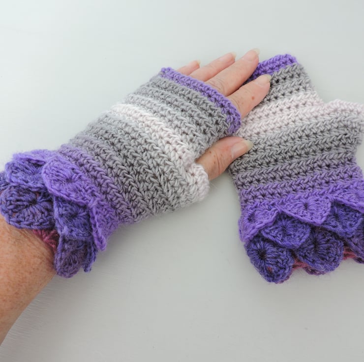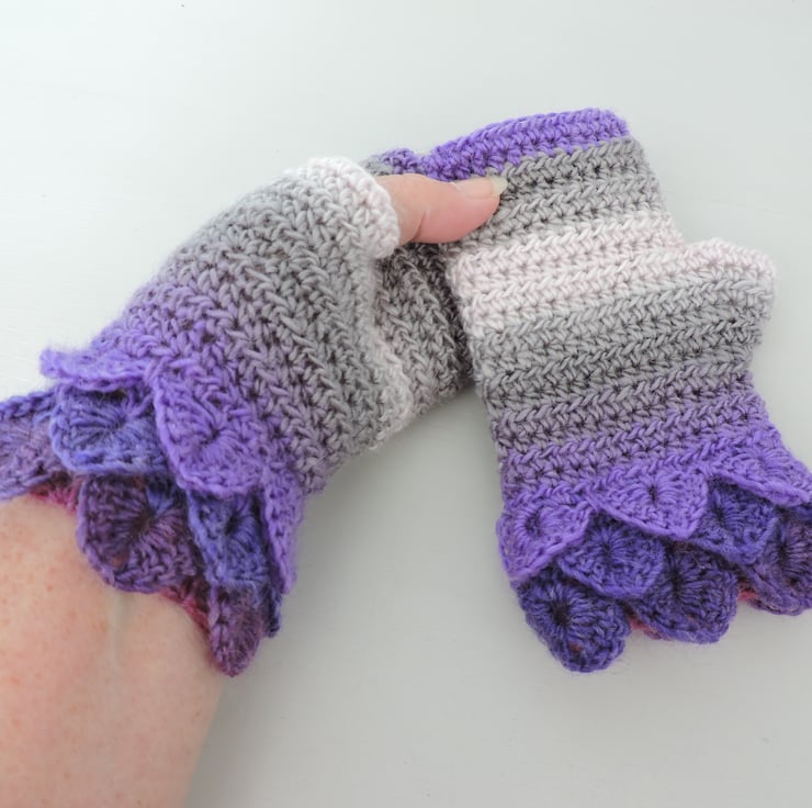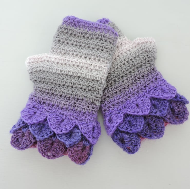 SALE now £8.50 was £12.50 Pretty crochet dragon scale cuff fingerless mitts which have been made using an acrylic and wool graduated double knit yarn. Multi tonal colours of lavender, violet, grey and the palest pink. They have a plain body with dragon scale cuffs. Warm and soft, ideal for the cold weather.