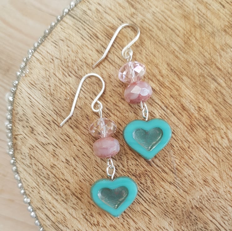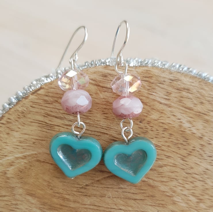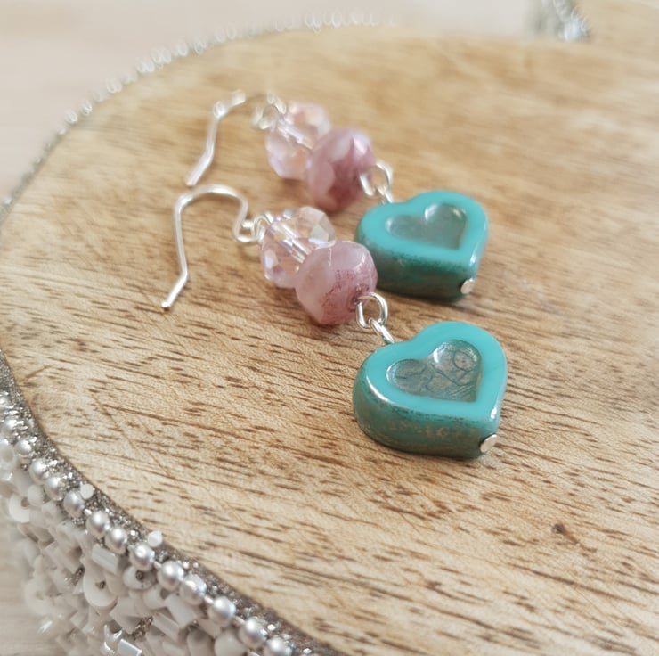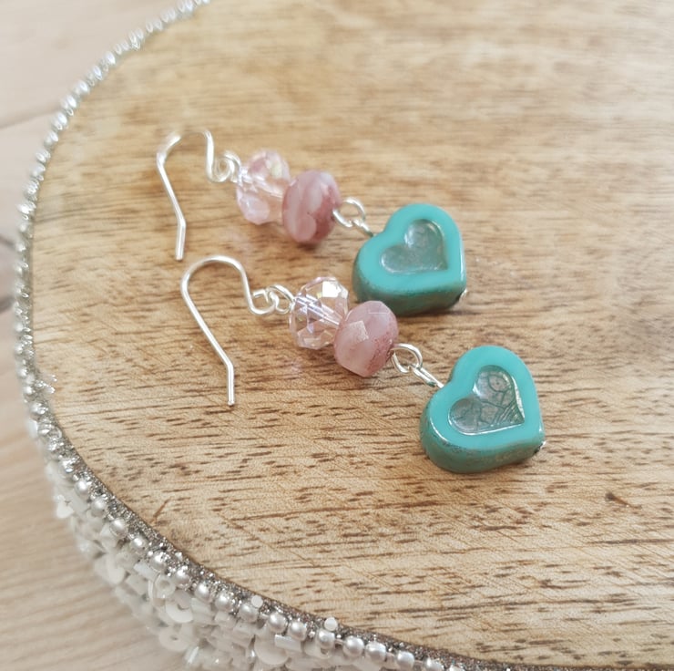 These earrings are just so pretty and are such a gorgeous colour! A stunning 14x12mm Czech glass heart in silvered turquoise is complimented perfectly with a dusty pink coated Czech glass bead and a brilliant pale pink Swarovski crystal bead which reflects the light to shimmer and shine. The silver plated earring hooks are handmade in 0.8mm wire.