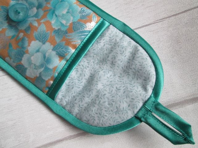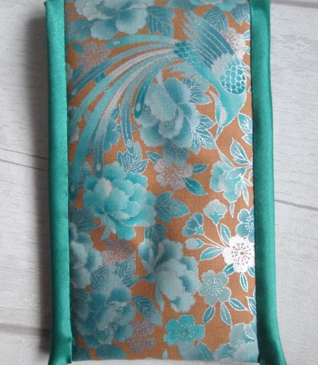 A really pretty glasses or phone case in a Regency style print of pale blue flowers and birds on a pumpkin orange background all picked out in metallic silver. It is lightly padded to protect the contents and is lined with a ditsy leaf print in shades of duck egg and is finished with jade satin bias binding with a button and loop fastening. A matching notebook cover is also available.