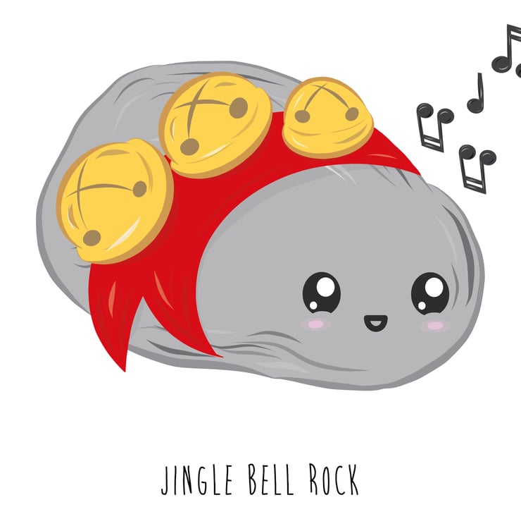 An A6 (folded) Christmas card made with 350gsm FSC card depicting a hand drawn rock with bells around it's 'waist'. A happy cartoon style face with musical notes. The card is silk coated on the outside to make the image pop and matt on the inside so you can easily write your own message.