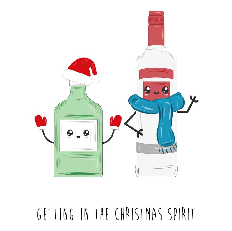 An A6 (folded) Christmas card made with 350gsm FSC card depicting a hand drawn bottle of gin and a bottle of vodka. The gin has a Christmas hat and mittens while the vodka has a scarf. Both have happy cartoon style faces. The card is silk coated on the outside to make the image pop and matt on the inside so you can easily write your own message.