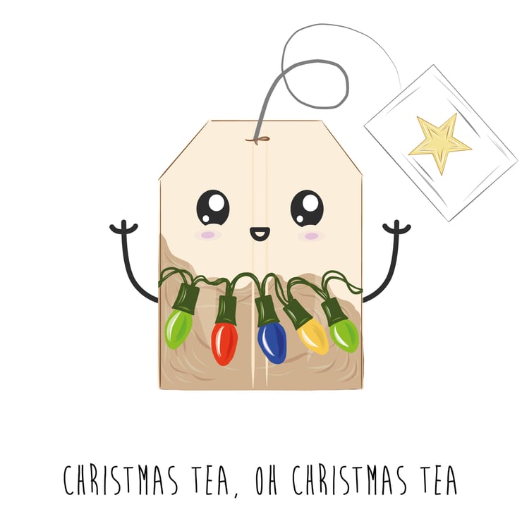 An A6 (folded) Christmas card made with 350gsm FSC card depicting a hand drawn tea bag with Christmas lights and a happy cartoon style face. The card is silk coated on the outside to make the image pop and matt on the inside so you can easily write your own message.