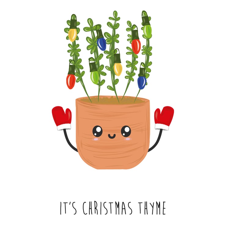 An A6 (folded) Christmas card made with 350gsm FSC card depicting a hand drawn flower pot growing thyme, Christmas lights, mittens and a happy cartoon style face. The card is silk coated on the outside to make the image pop and matt on the inside so you can easily write your own message.