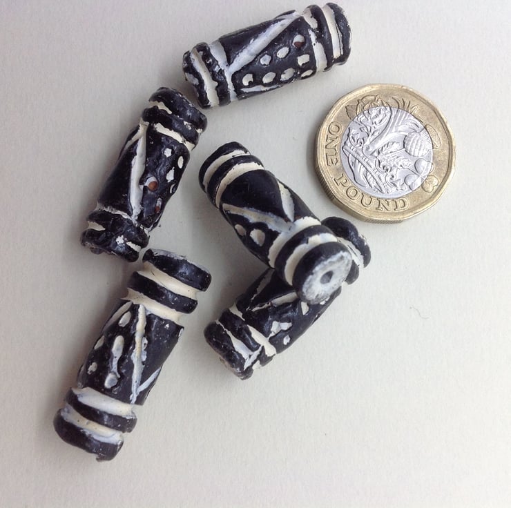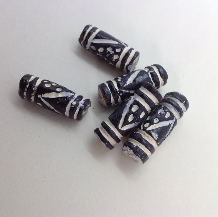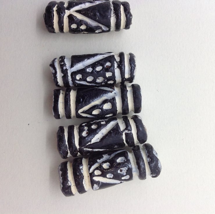 A pack of 5 clay tube beads, hand painted in black and white. I believe thay're from Africa but I don't know their exact origin or whether they have ever been used or not. The patterning is striking.