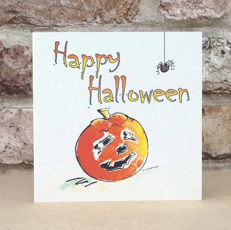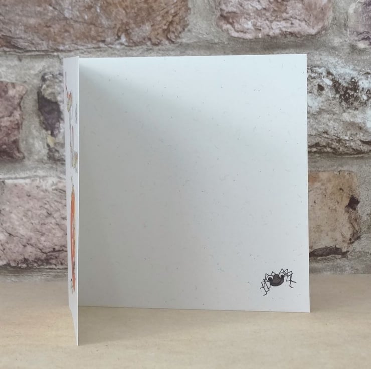 This Pumpkin and Spider Halloween ecofriendly card has been printed using my original pumpkin illustration. It has been printed on 100% recycled oatmeal finish style 320g card which has a lovely naturally occuring flecks as seen in the photograph above.