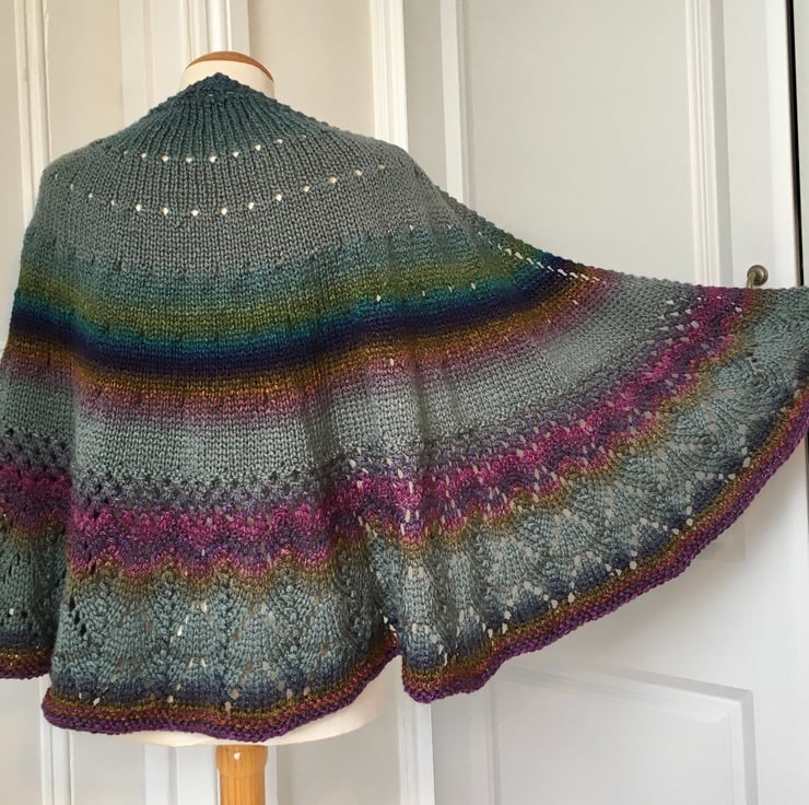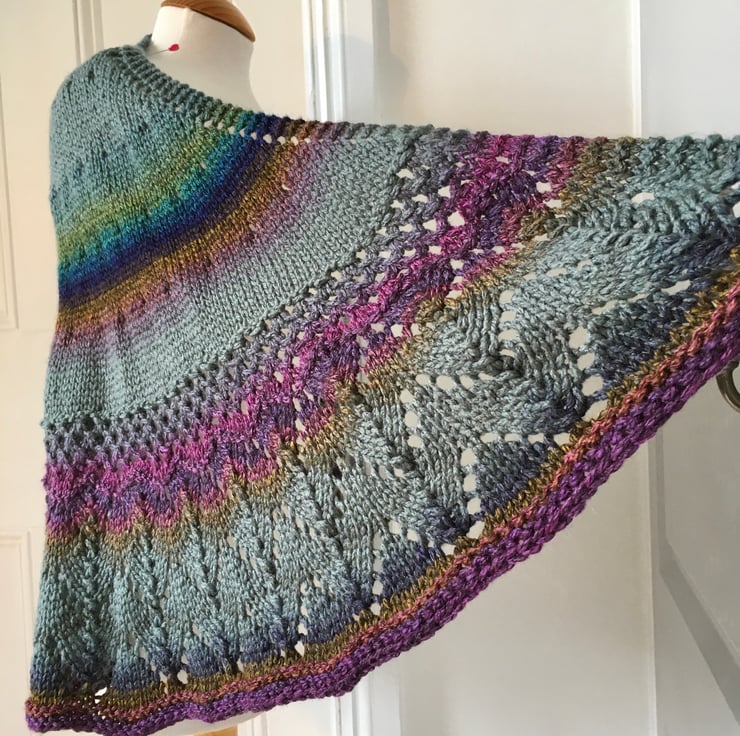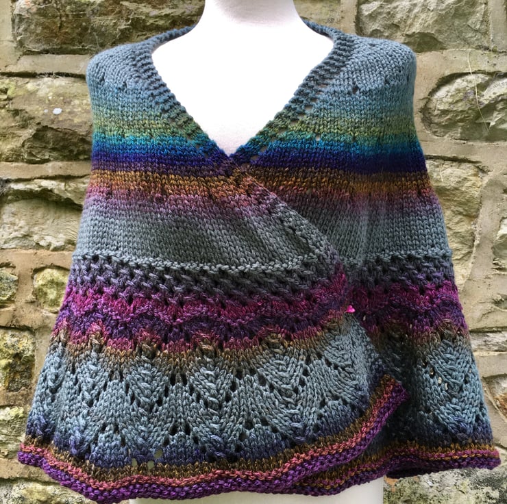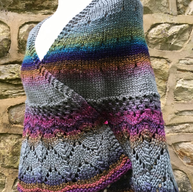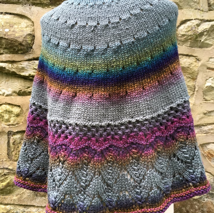 Hand knitted by me in soft Aran weight chain yarn with some wool content. This particular colour combination is called Jewel and has some bright colours in a blue grey background