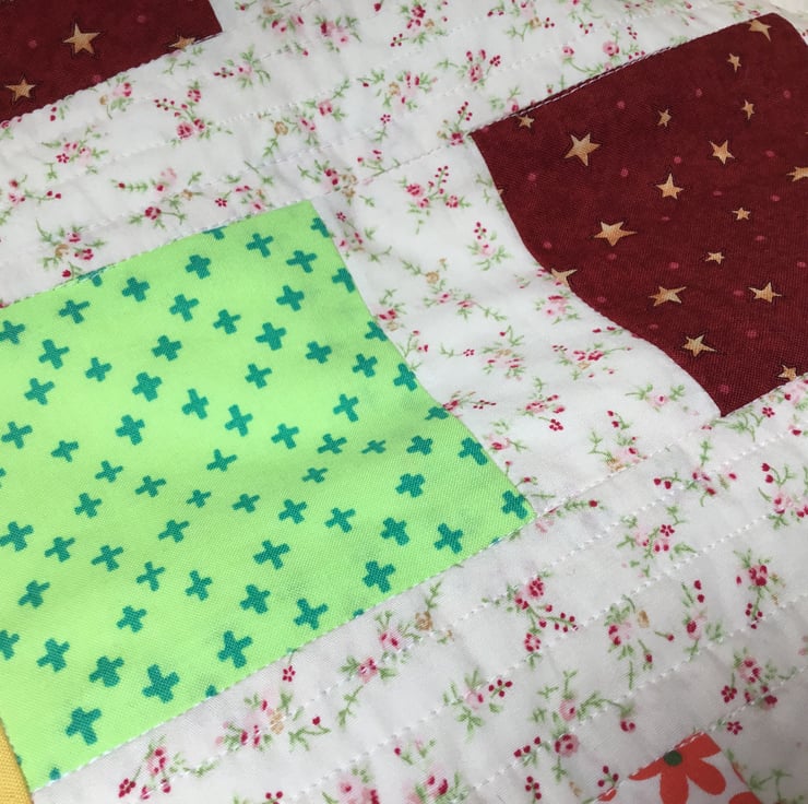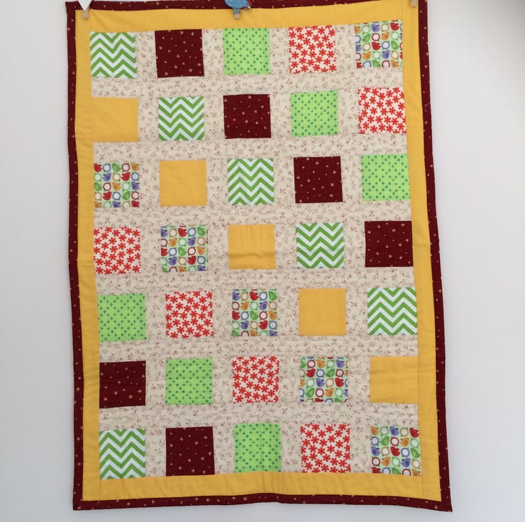 This quilt measures 98 x 70cm and is machine washable on a gentle wash.