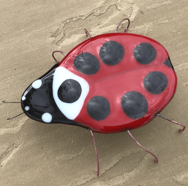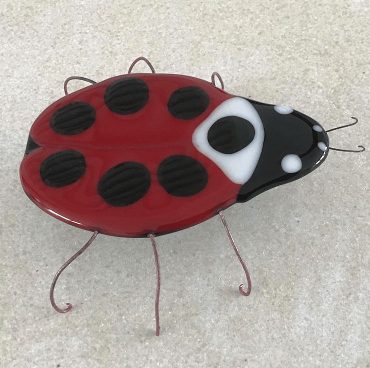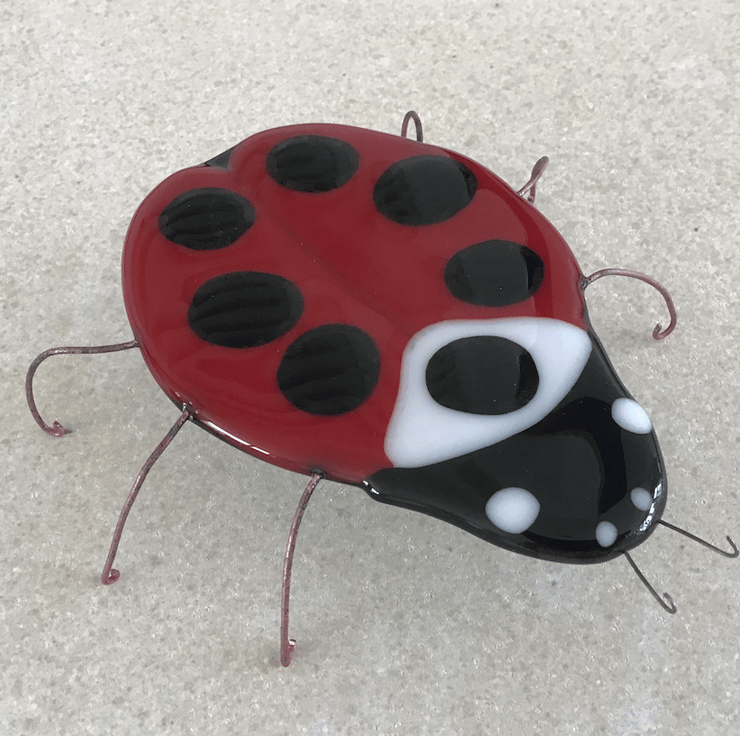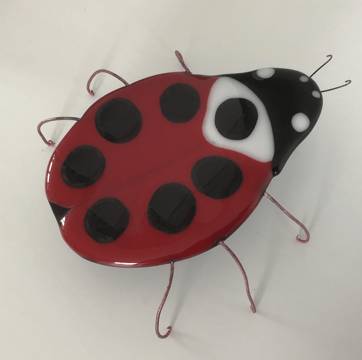 A bright and cheerful fused glass ladybird to decorate a corner of your own garden or a fun gift for a gardener. Made from a selection of opaque glasses, cut by hand, with copper wire legs and nichrome feelers, and then kiln-fused to give a smooth, high-gloss finish.