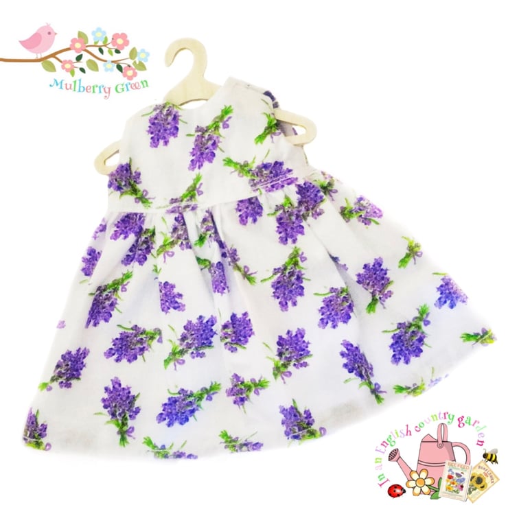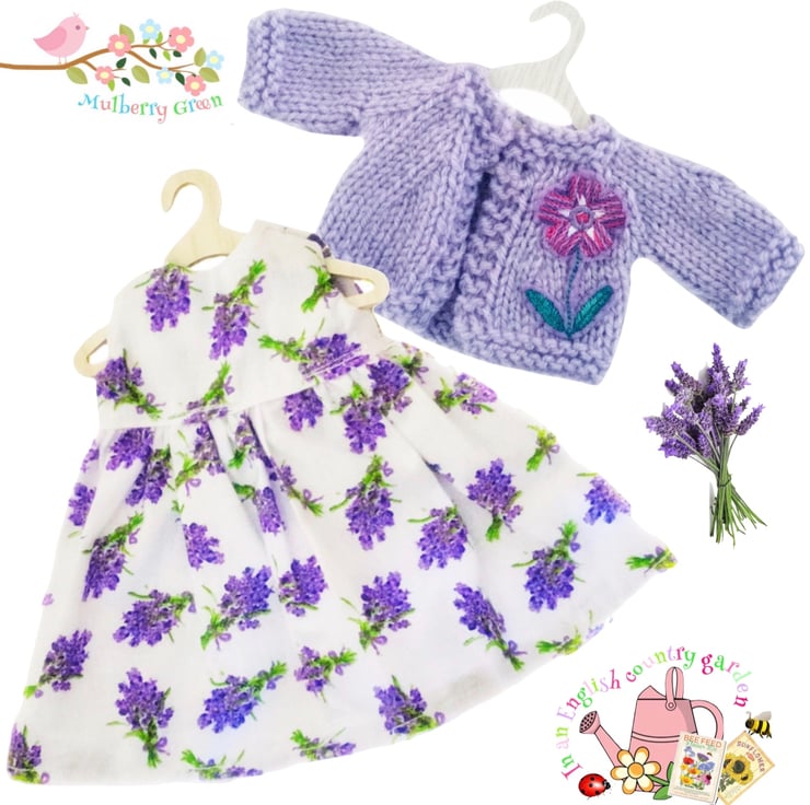 A pretty little dress covered in little bunches of lavender to fit the Mulberry Green characters. The dress is made from best quality cotton, has a full skirt and a lined bodice and comes on a cute little wooden hanger. It goes well with the lavender cardigan.