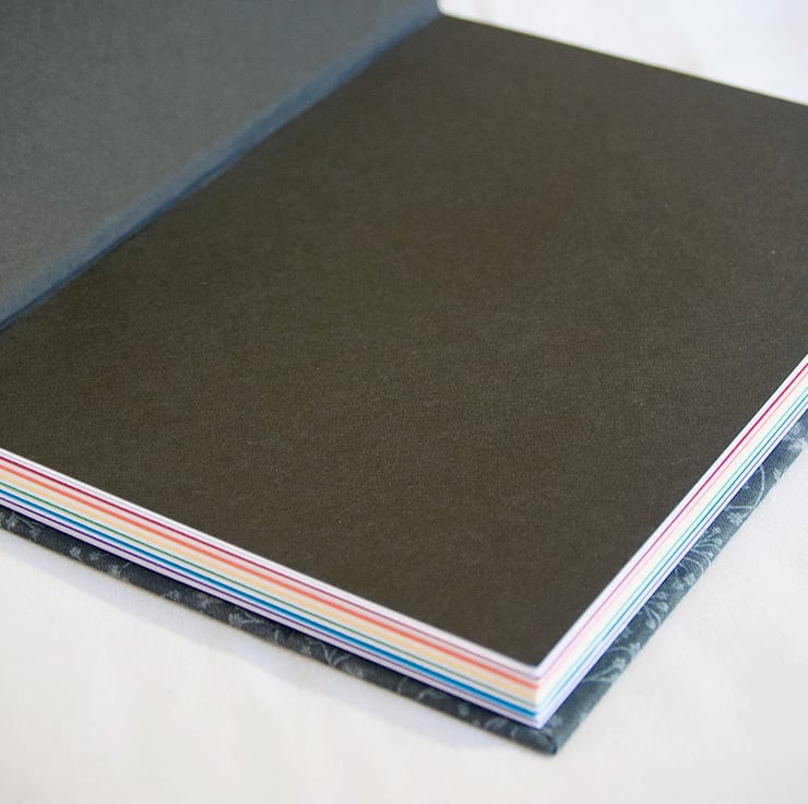 This hand-crafted book is ideal for all sorts of note-taking, list-making and drawing. The paper, a mix of 100gsm white paper and 80gsm coloured paper, is smooth and takes pencil and ink. Different coloured sections are great for organising your thoughts and doodles.