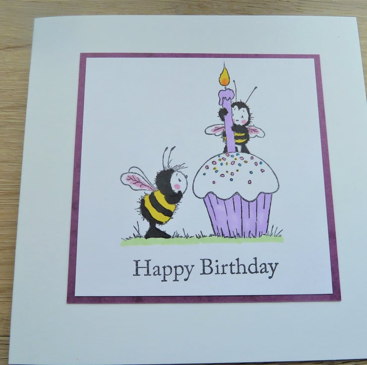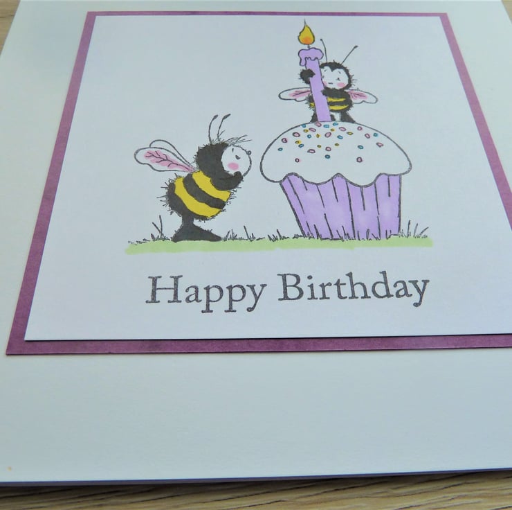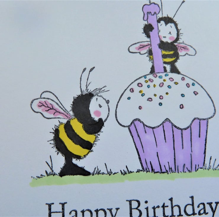 A card which features a hand stamped image of two bees with a cupcake, the image has been hand coloured.