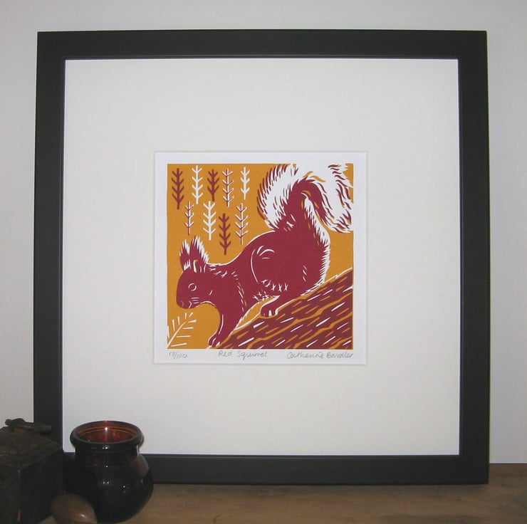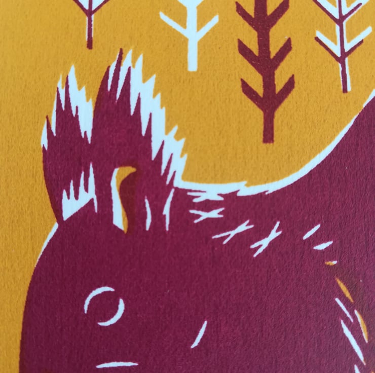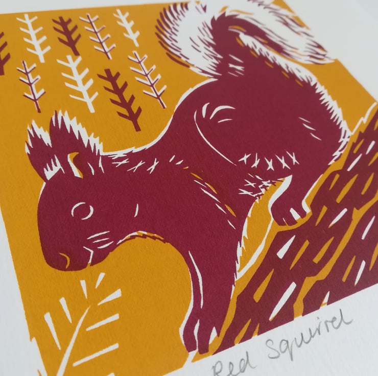 Bright, cheery handmade screen print of a popular British mammal, the Red Squirrel. Every part of the process is done by hand, from the initial sketches, to dark room processes, mixing inks and of course the printing! This print is a limited edition of 100, and printed onto Fabriano acid free 50% hot pressed cotton paper. The image size is 130 x 130 mm, and the print comes unframed and packaged with acid free card in a cello bag. Colours are plum and ochre.