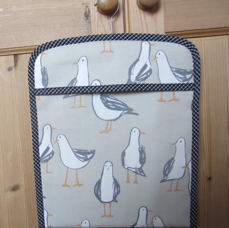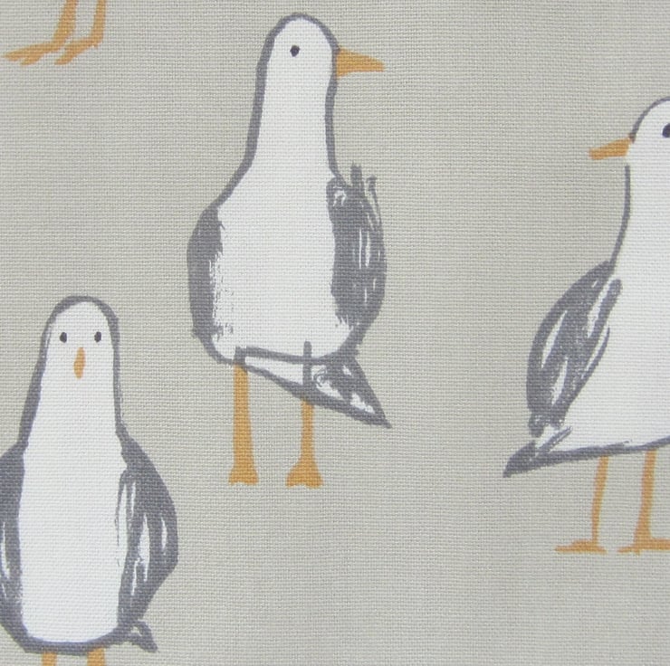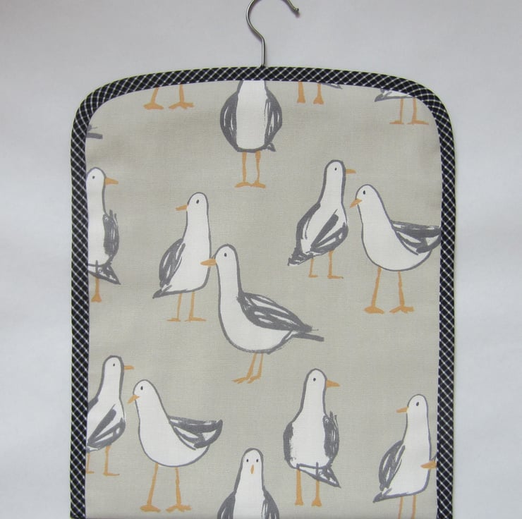 This sturdy peg bag is made with fabric featuring seagulls on a light fawn background.