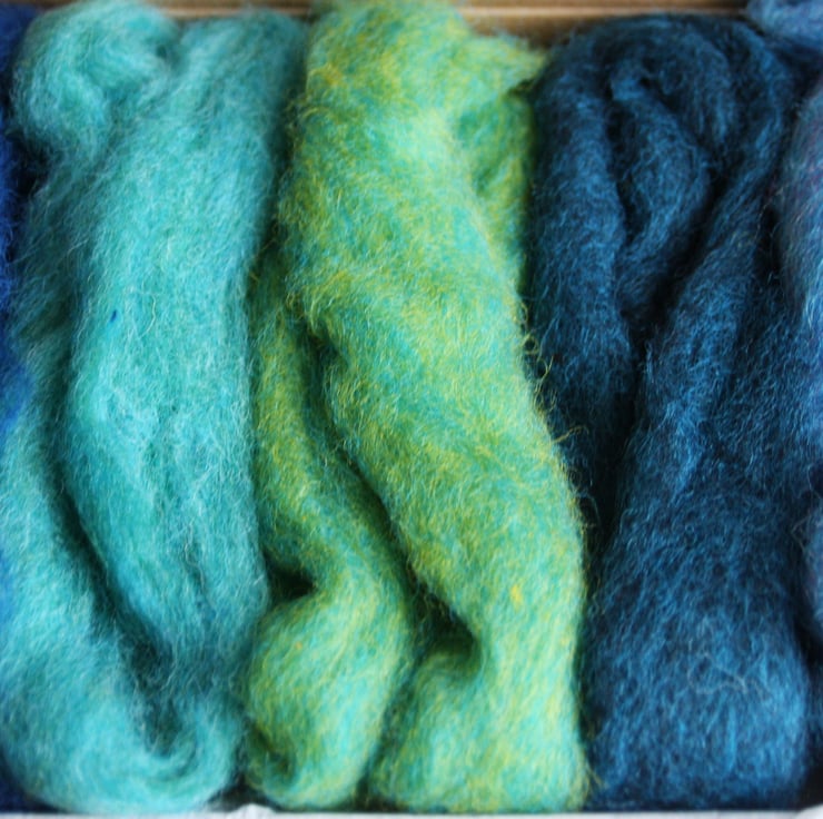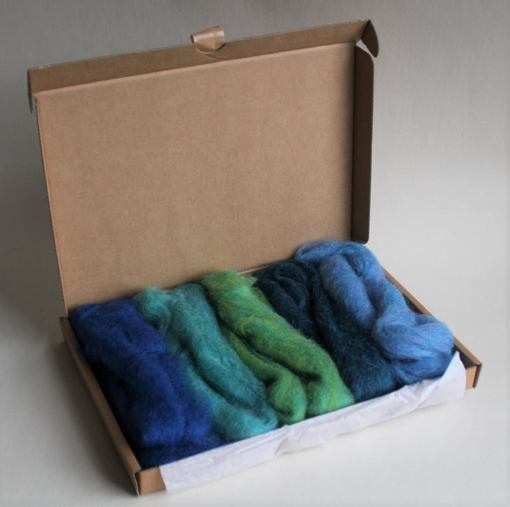 The blue box. A small wool pack containing 25g of carded Corriedale slivers in five different bluey shades (5g of each). These smaller packs are sent in convenient large letter boxes and sent by Royal Mail. (If ordering more than one pack, please note that they may be sent together as a larger parcel by courier)