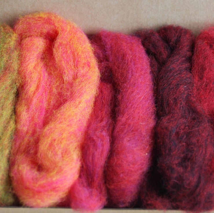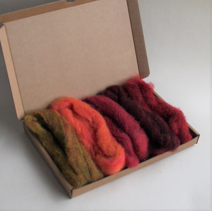 A small wool pack containing 25g of carded Corriedale slivers in five different warm colours from rich red and fruity orange to autumnal woodland floors (5g of each). These smaller packs are sent in convenient large letter boxes and sent by Royal Mail. (If ordering more than one pack, please note that they may be sent together as a larger parcel by courier)