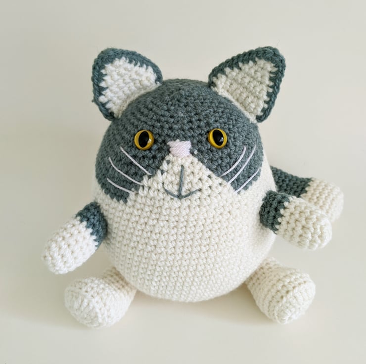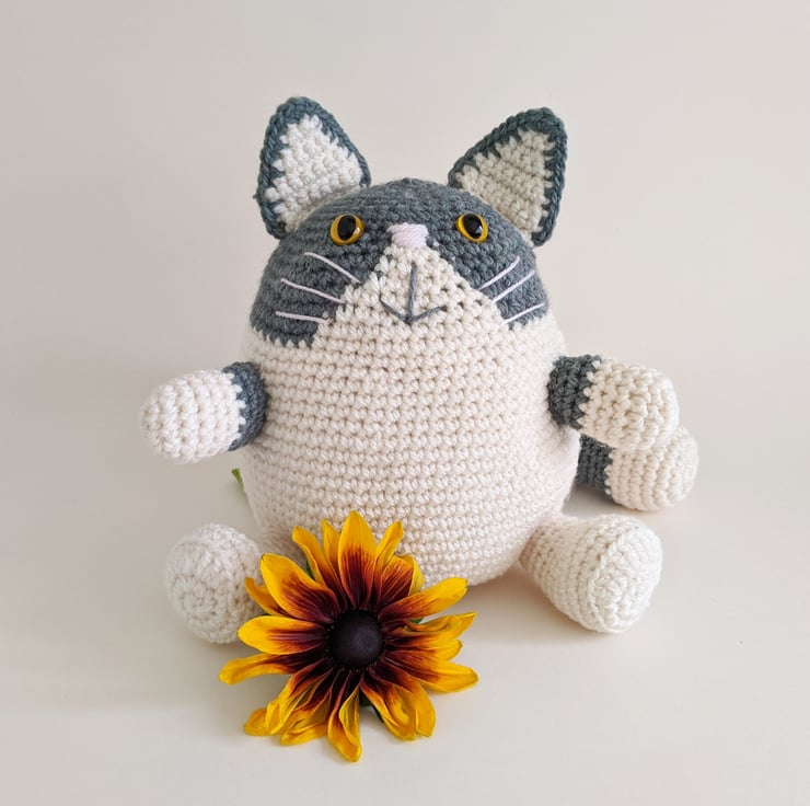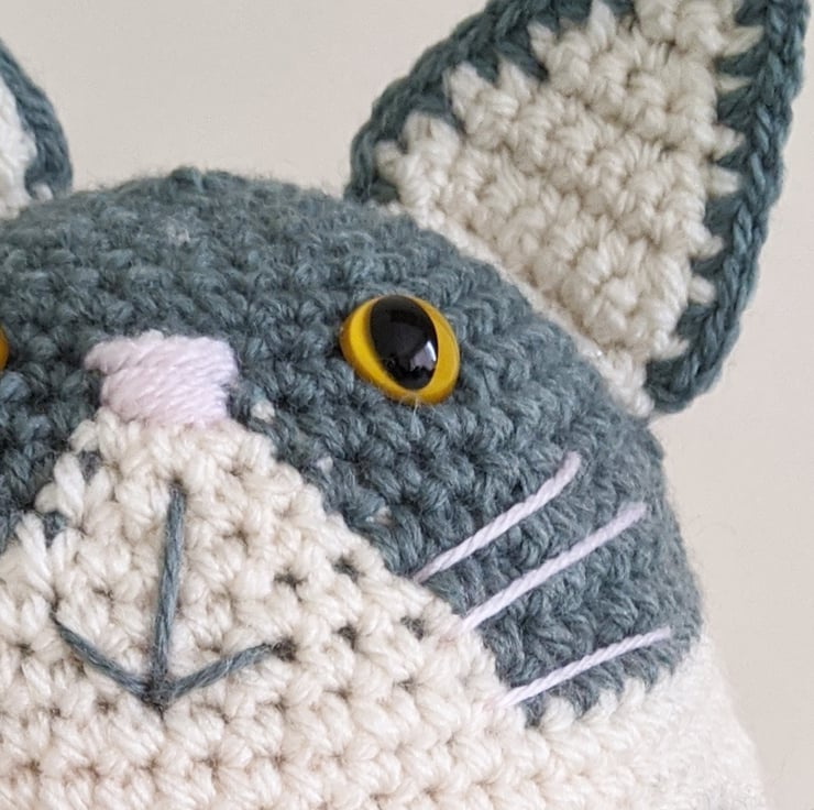 Crocheted from cream and sage green yarn, with orange safety cat eyes, embroidered nose, mouth and whiskers. This doorstop is guaranteed to make you smile, cute and practical all in one.