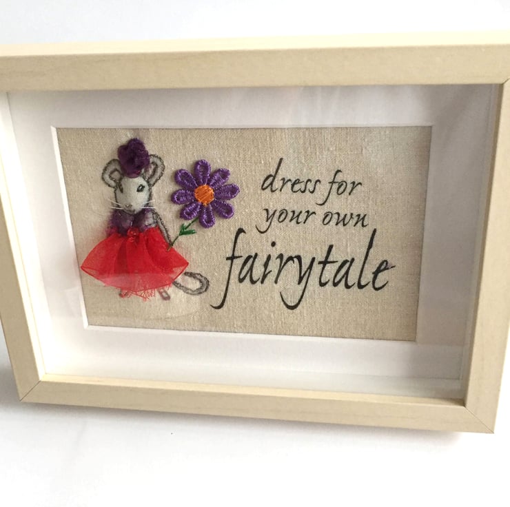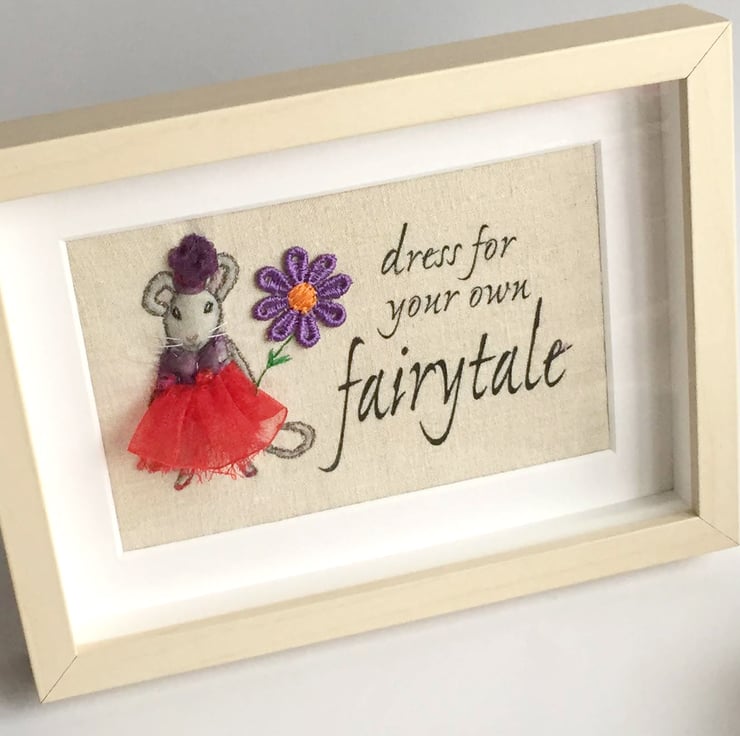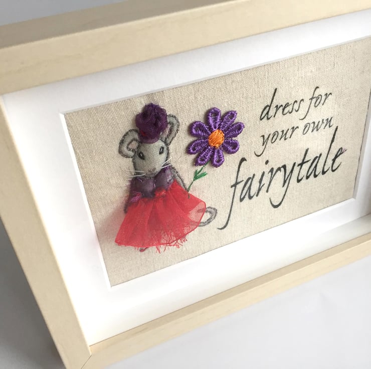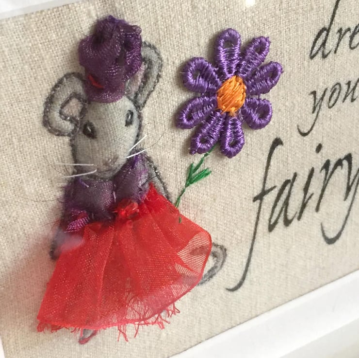 3d dressed-up fabric mouse picture, handmade of embroidery, fabric and ribbon