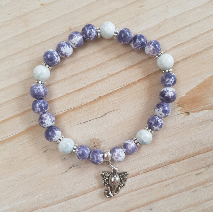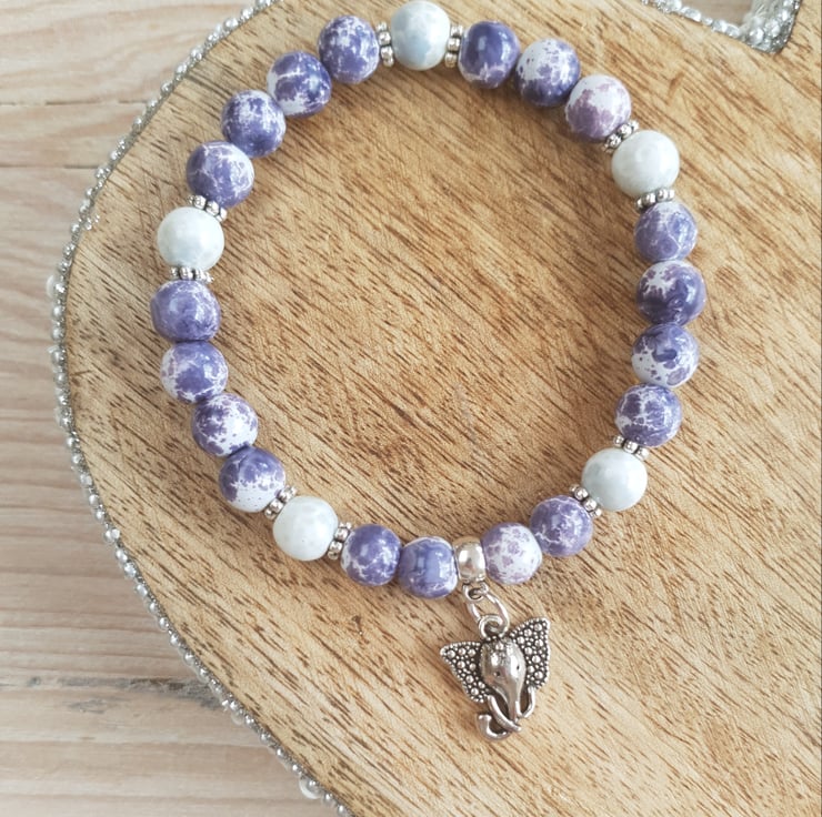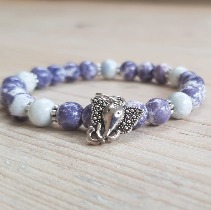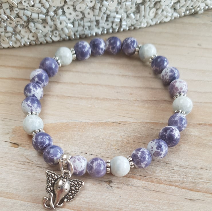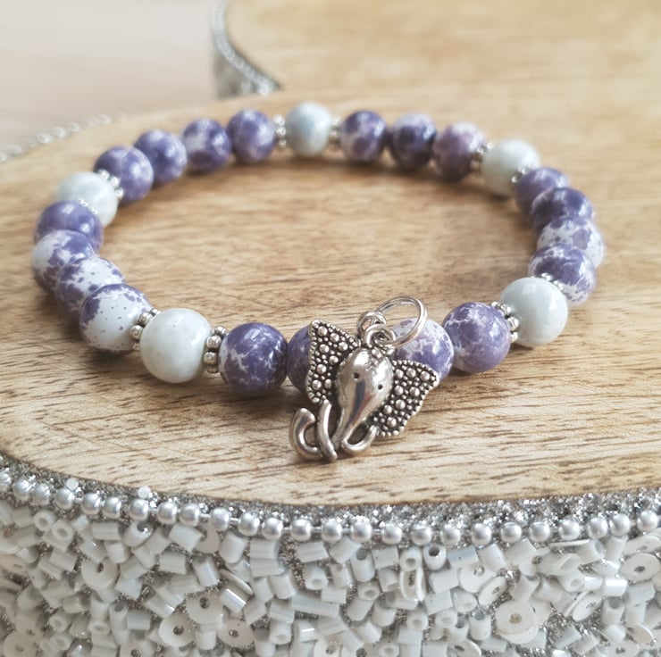This bracelet features the prettiest elephant charm, she is so sweet! Purple watercolour splash effect Jade semi precious beads are mixed white watercolour jade semi precious beads and dotted with silver bead spacers for added shine. The prettiest embossed elephant charm hangs at the centre.