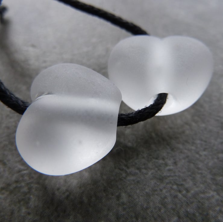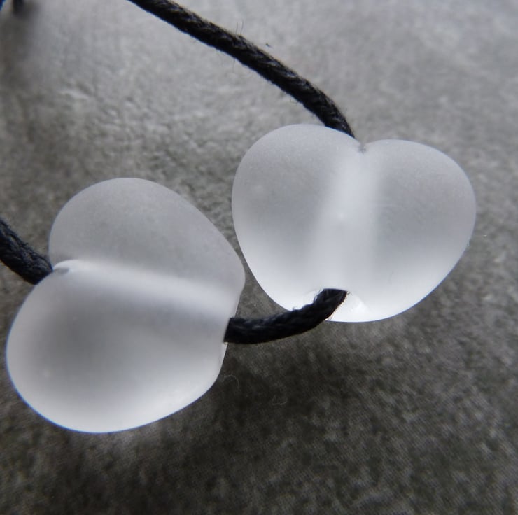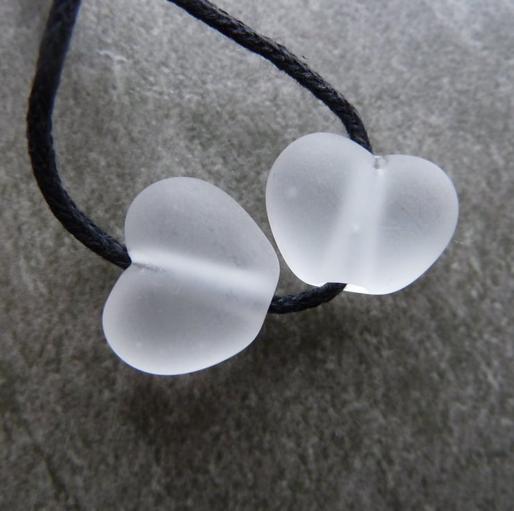 A pair of lampwork glass beads made with clear glass and shaped into hearts. They have been tumbled to give a frosted finish.