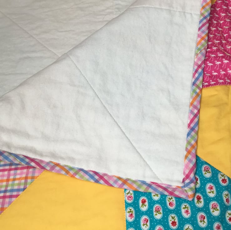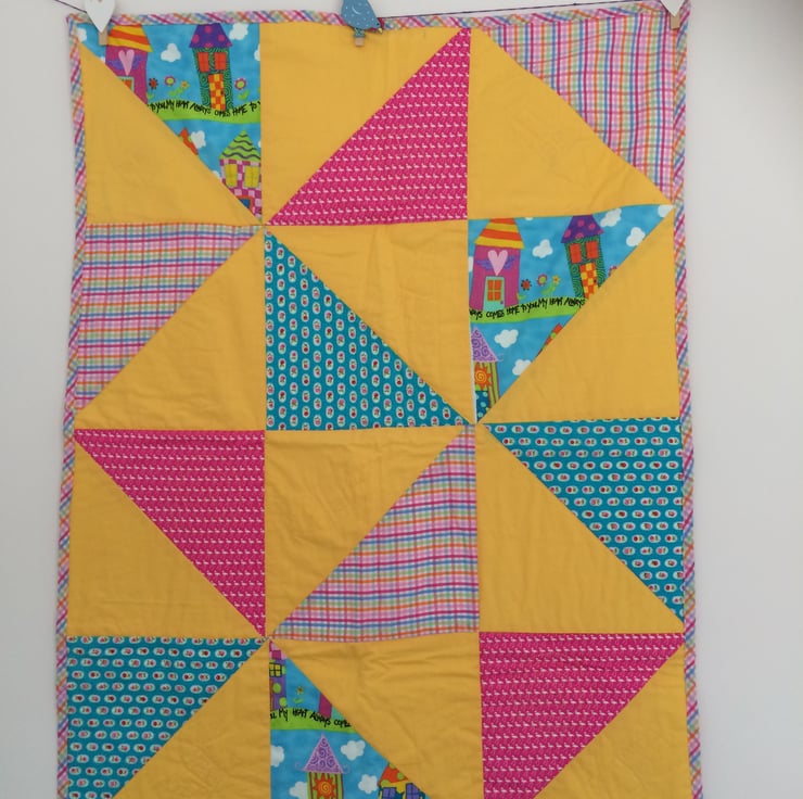 What a lovely combination of colours in this quilt! It would certainly brighten up the nursery! The front is made from a patchwork design of 100% cotton fabrics. The back is a soft, white, brushed cotton and sandwiched between the two is a cosy layer of bamboo wadding. Bamboo is hypoallergenic and great to keep baby warm when it’s cold and cool when it’s hot. The quilt is ideal for baby’s cot, as a play mat on the floor or for tucking around the car seat. The patchwork features triangles in a windmill design with a base colour of bright yellow complimented by pink flamingos, turquoise florals, pastel check and a delightful house design. The quilt measures 100 x 76cm, is made from top quality materials and is machine washable on a gentle cycle.