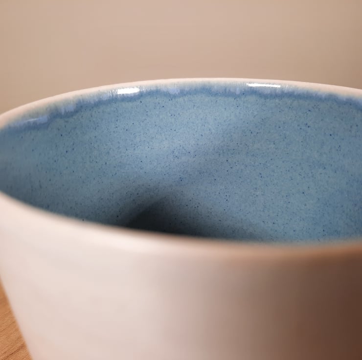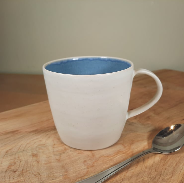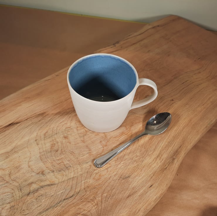 A large mug which has a glossy blue inside with white matt glaze on the outside.