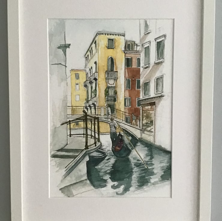 Print taken from the artist’s own original watercolour painting of a Gondolier about to row under a beautiful little bridge in Venice. Printed on top quality 100% cotton archive paper and measures 297mm x 210mm in size and 405mm x 304mm with mount. Sold mounted but without frame.