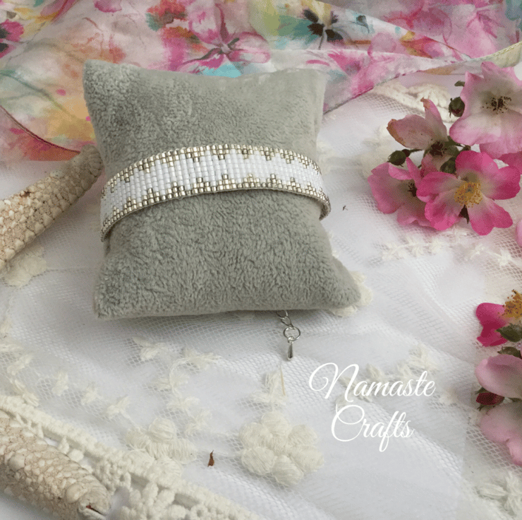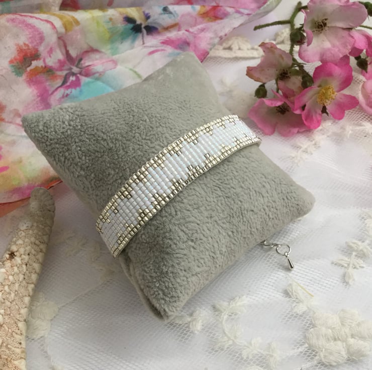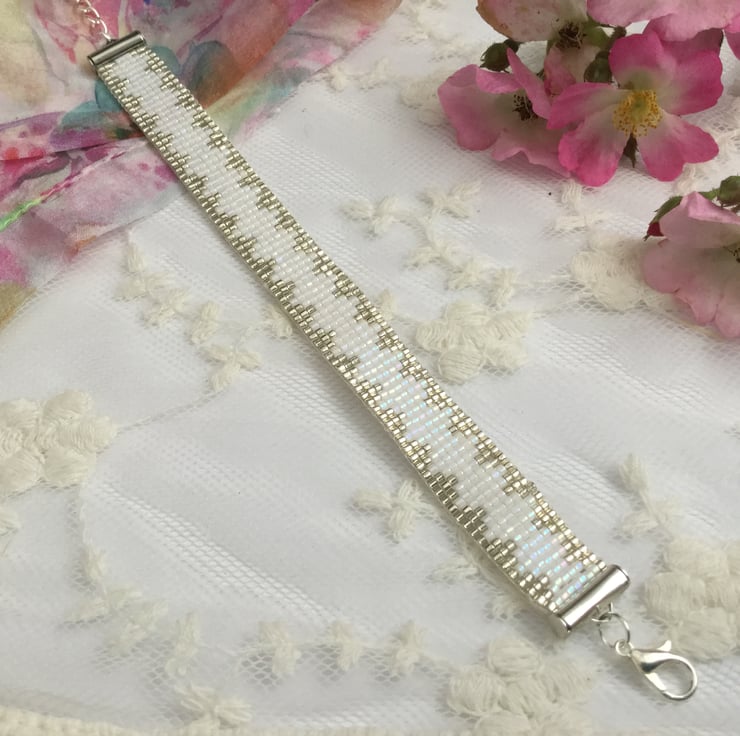 I have created this gorgeous original elegant glass beaded loom friendship bracelet in white and silver.