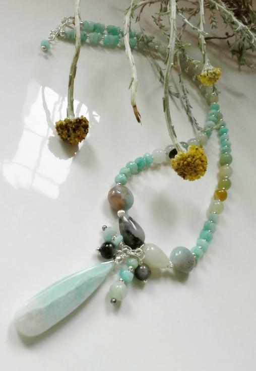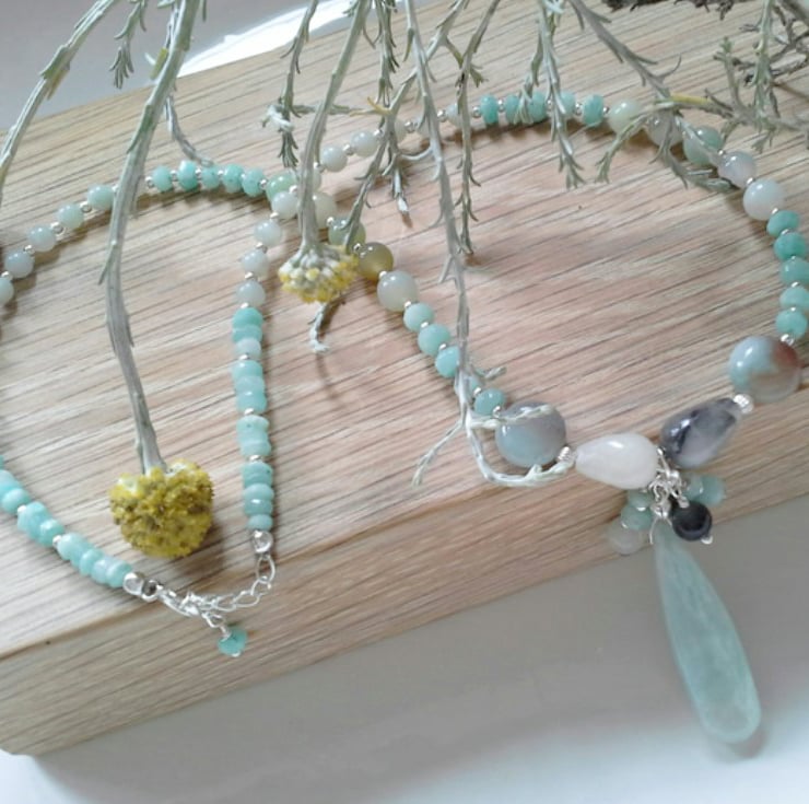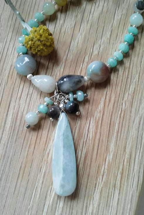 An absolutely beautiful necklace designed and hand crafted using a total of 105cts genuine untreated amazonite gemstones. The centre has one large elongated top drilled bead with a variety of rounds and rondelle clusters surrounding it. This item will make a perfect gift for ladies of all ages whom enjoy owning and wearing designer unique genuine gemstone jewellery on a daily bases. It will also appeal to the professional working lady. Between each amazonite gemstone bead is a 2mm sterling silver spacer bead to add a touch of sparkle and a luxury ambulant finish.