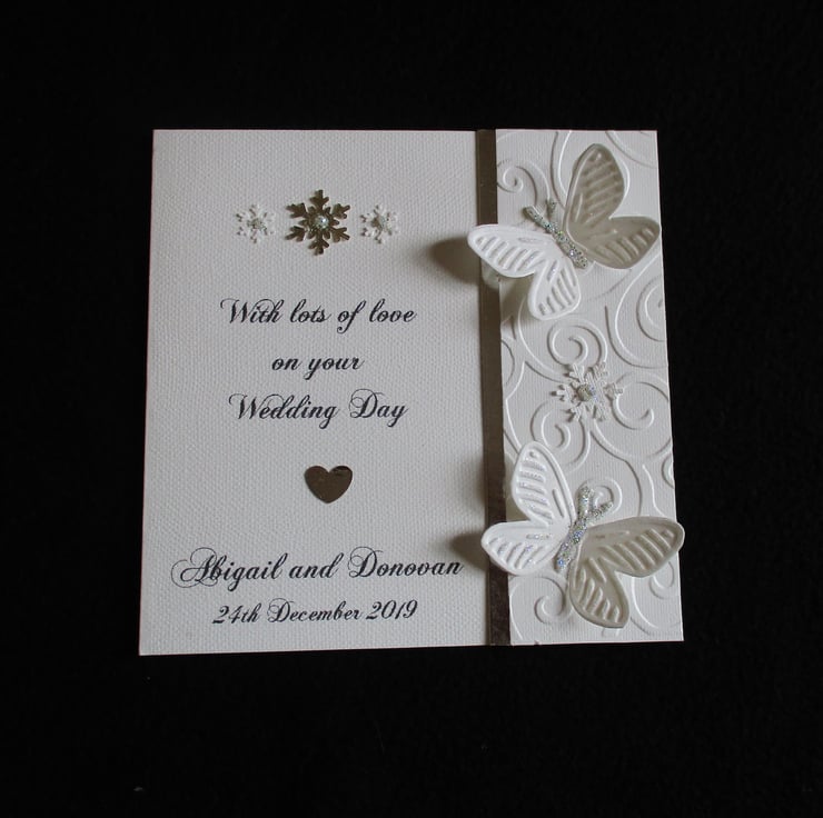 Embellished with two embossed sparkly butterflies and a selection of sparkly snowflakes in white and silver.