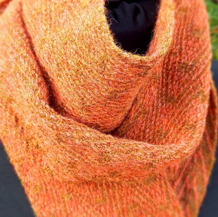This scarf has been handwoven using pure Shetland Wool in burnt orange and olive green colours in a point twill two-sided pattern. It is 4.5 inches/11 cm wide and 132inches /230cm long. It is finished with twisted tassels.