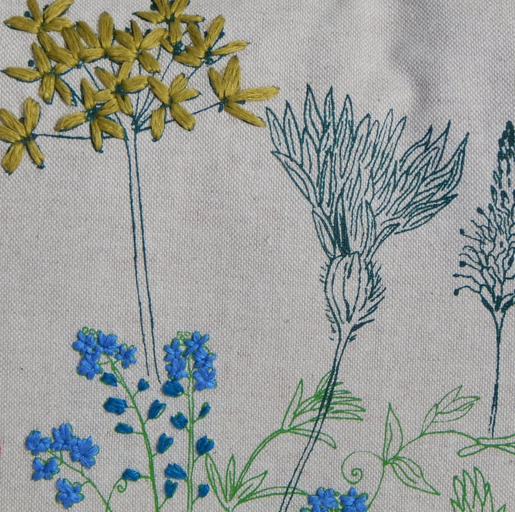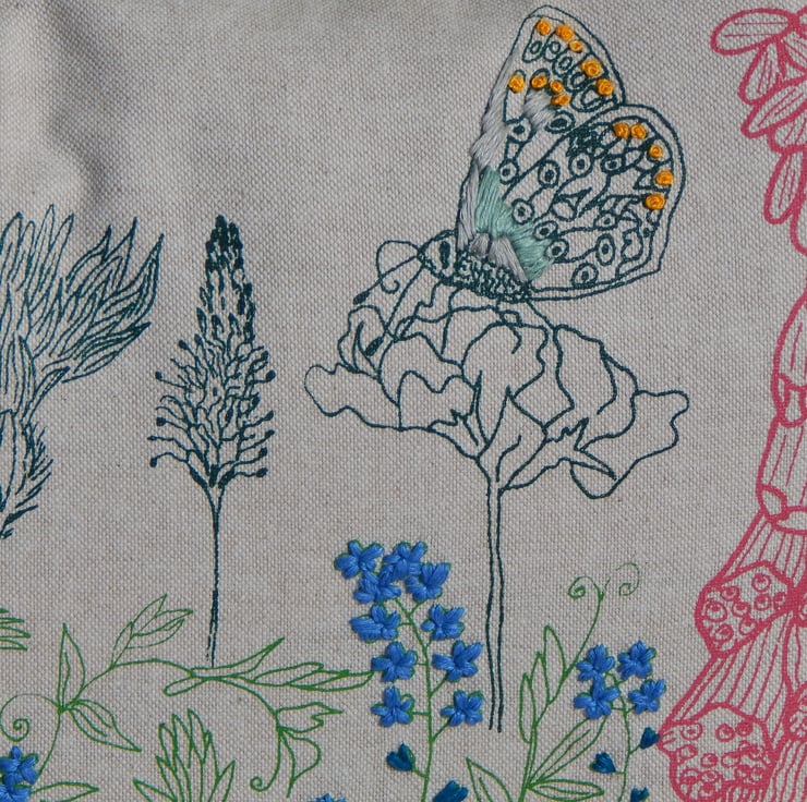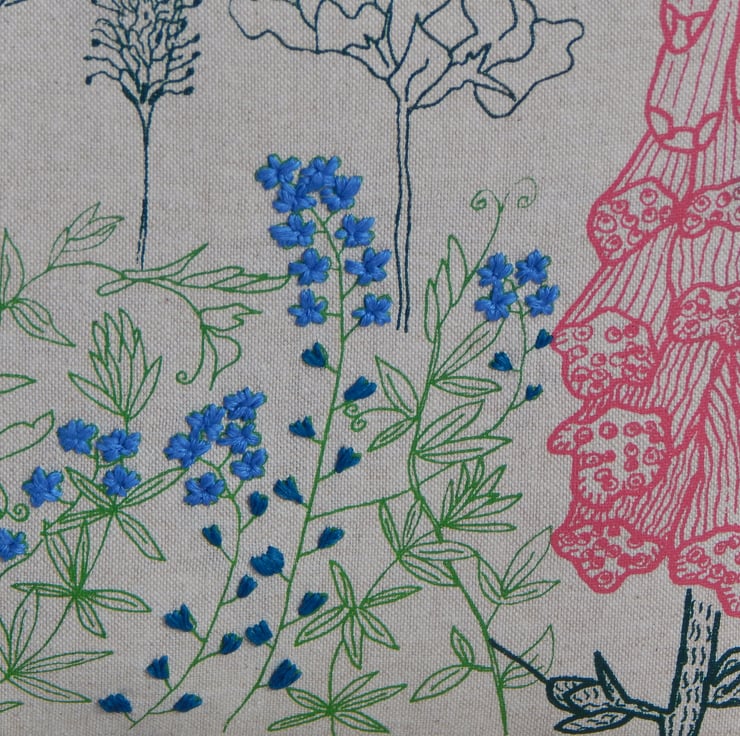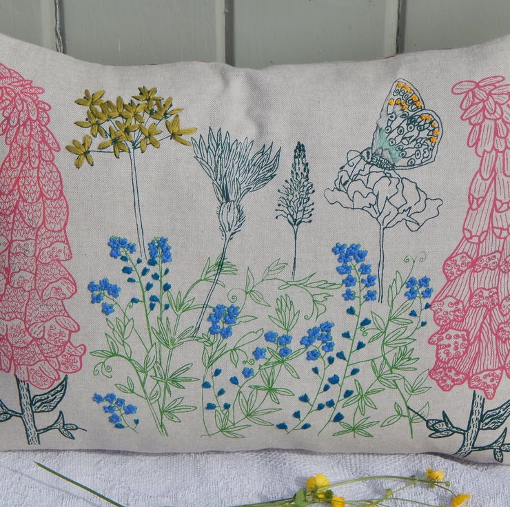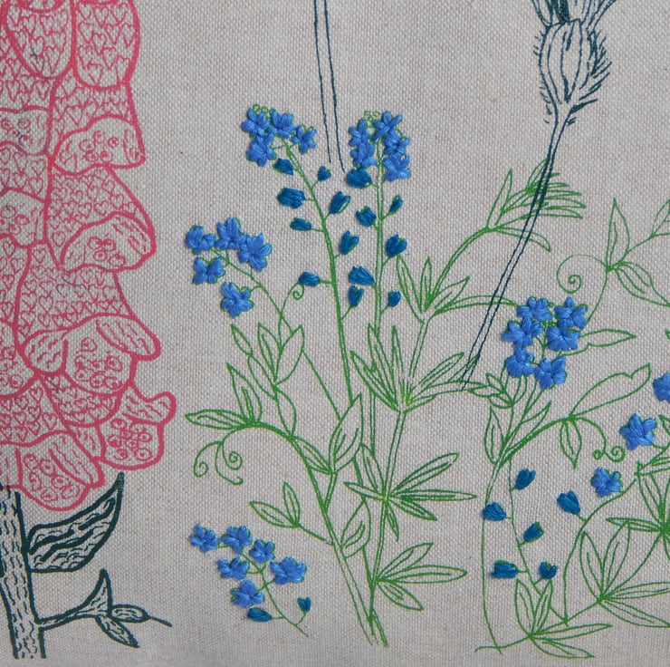 I have printed forget me nots on a larger screen then individually placed smaller screens with wild flowers and the butterfly. Foxgloves in 2 designs are down the sides of the cushion. The forget me nots, parts of the butterfly and the wild garlic are hand embroidered.