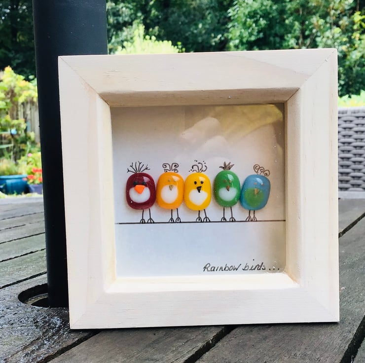 Rainbow birdies make up this cute little ready to hang picture which is in a 10cm whitewashed pine frame . Each bird is individually fused in my kiln using tiny glass components