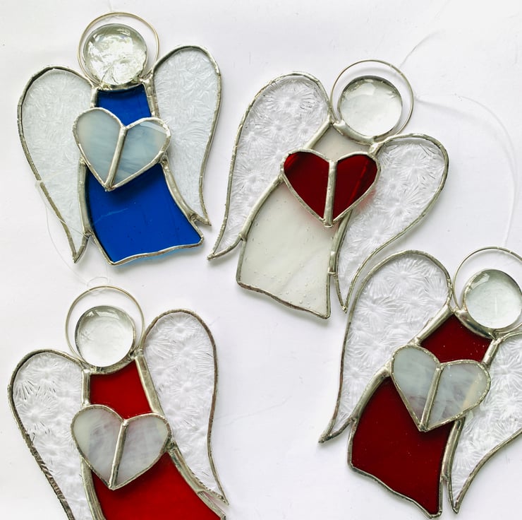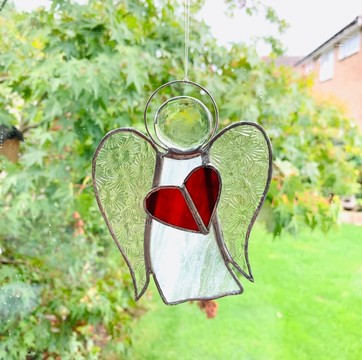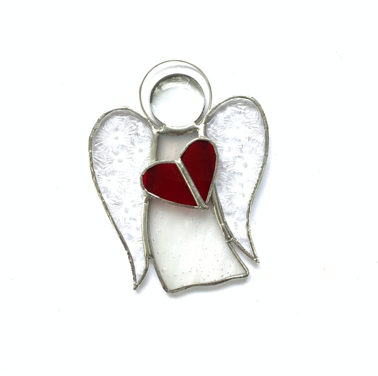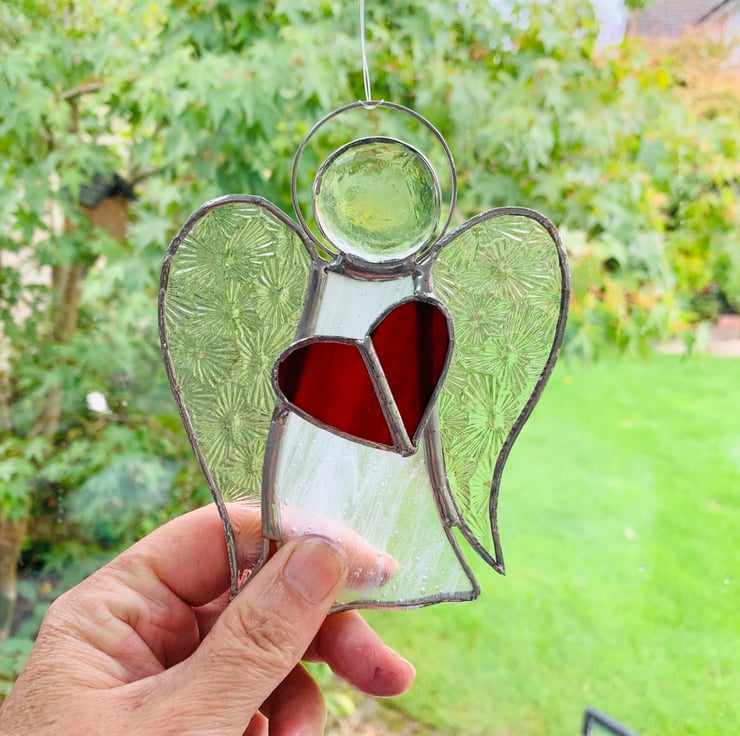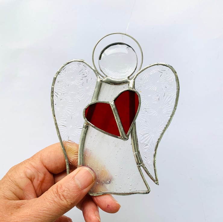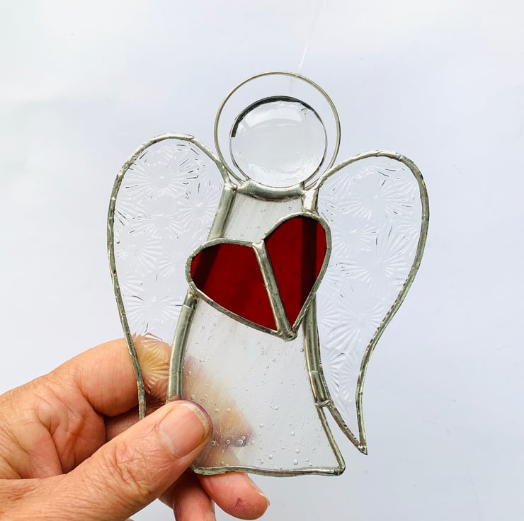 This particular angel has been made from white streaky sea glass, clear florentine glass has been used for the wings and the heart is red glass. A large glob has been used for the head and wire for the halo.