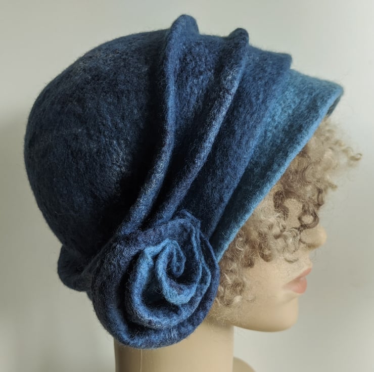 Handmade wet felted blue denim shaded merino wool cloche hat. It has a vintage feel to it, with an asymmetrical brim and two fold detail. A matching rose is attached to the hat with a hat pin, so it's position can be changed, or removed and used as a lapel pin.
