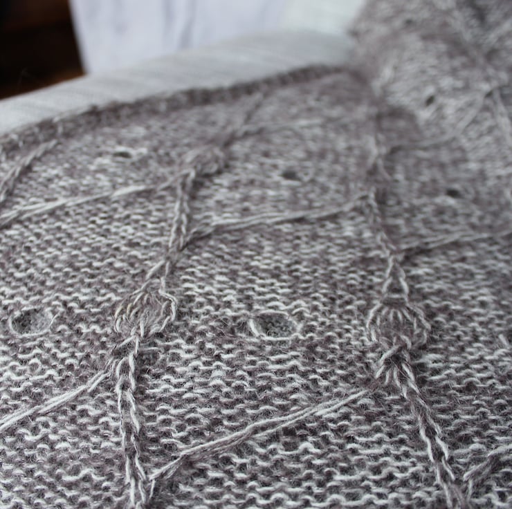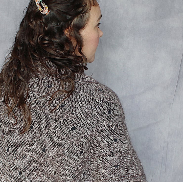 Loanin is a moreishly textured triangular shawl, knitted flat in one piece, beginning at one corner and working down to the cast off edge. A pattern of slipped and travelling stitches is worked across the shawl, with new repeats added every 24 rows. Small circular ‘apple’ motifs are made by working increase and decrease stitches and a video tutorial link is provided to help with this.