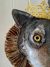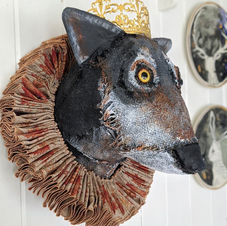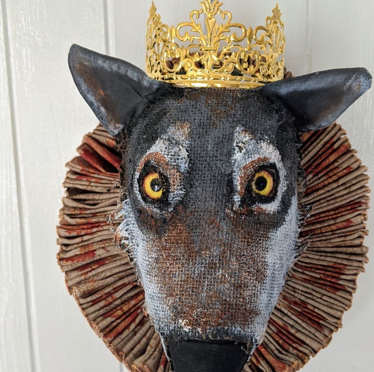 This is a hand and machine stitched as well as hand painted piece. A metal crown on its Royal head and a handmade Elizabethian collar around its neck. It is hung by a D ring on a wooden back.