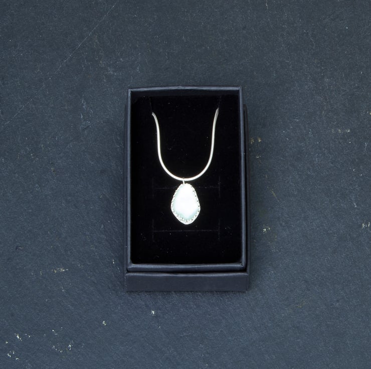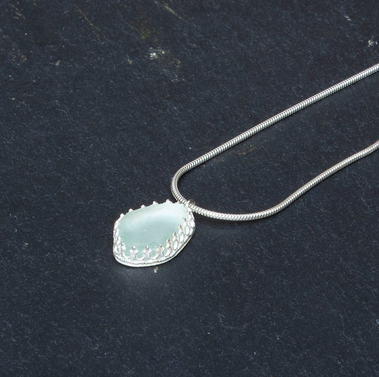 Handmade sterling silver sea glass pendant. I collected the sea glass from a beach near the site of a Victorian glassworks, and it's over a century old. The glass measures 13mmw x 18mmh and is mounted in sterling silver and hung from an 18 inch snake chain.