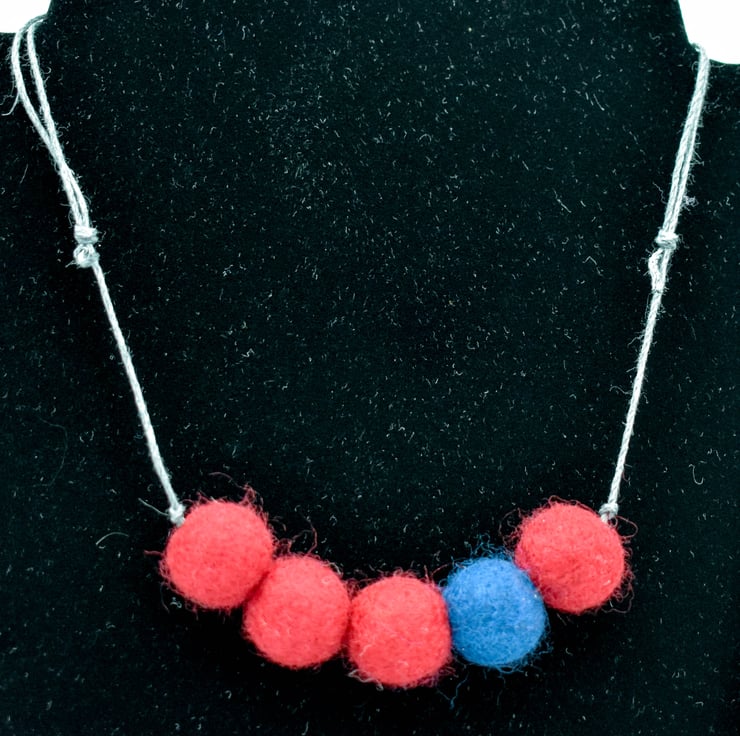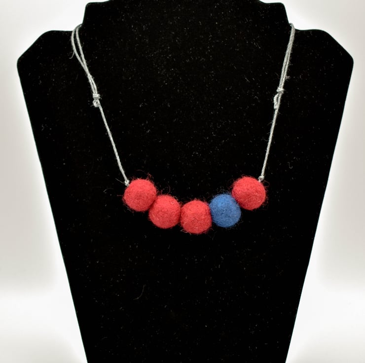 This statement necklace has been created using five felted beads made from burgundy red and navy blue merino wool and strung on dark grey 1mm hemp cord.