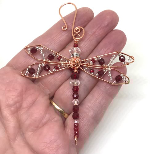 I have created this pretty dragonfly with copper wire using wire wrapping techniques. The dragonfly shape is gently hammered to strengthen, I have then threaded and wrapped beautiful sparkling red fire pollished crystals, silver lined crystal and red seed beads on and around the shape with copper wire. A handcrafted copper hook is attached for hanging.