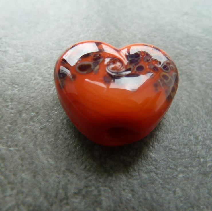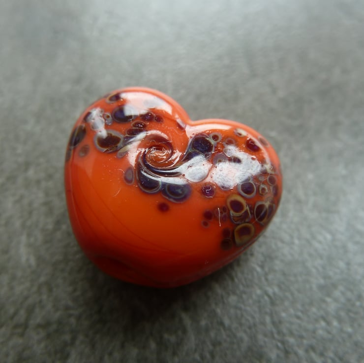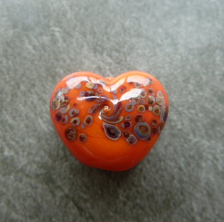 A lampwork glass bead made with orange glass, rolled in reactive frit and shaped into a heart using a brass press.