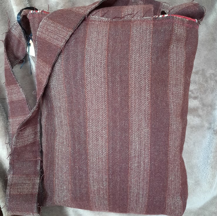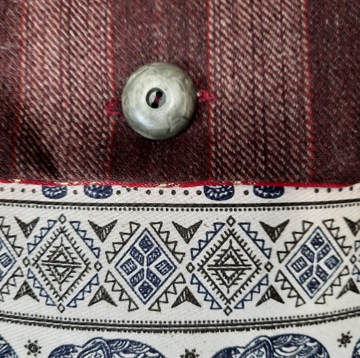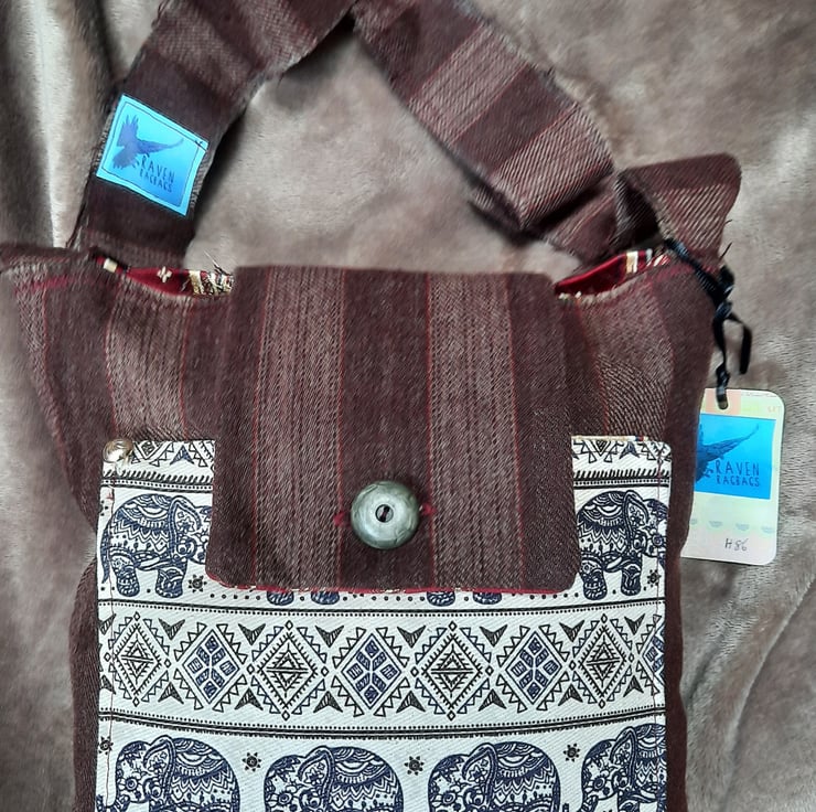 A real beauty and the perfect gift if you love elephants and who doesn't? Handmade from a rich brown and red wool blend fabric and featuring a large elephant design front pocket with gold button detail and fastening with a rustic green button. The bag measures 27cm wide by 30cm deep and has a raw edged shoulder strap of 105cm. inside, the bag is fully lined with luxurious dark red and gold polyester satin and has a large inside pocket with ivory rose buttons.