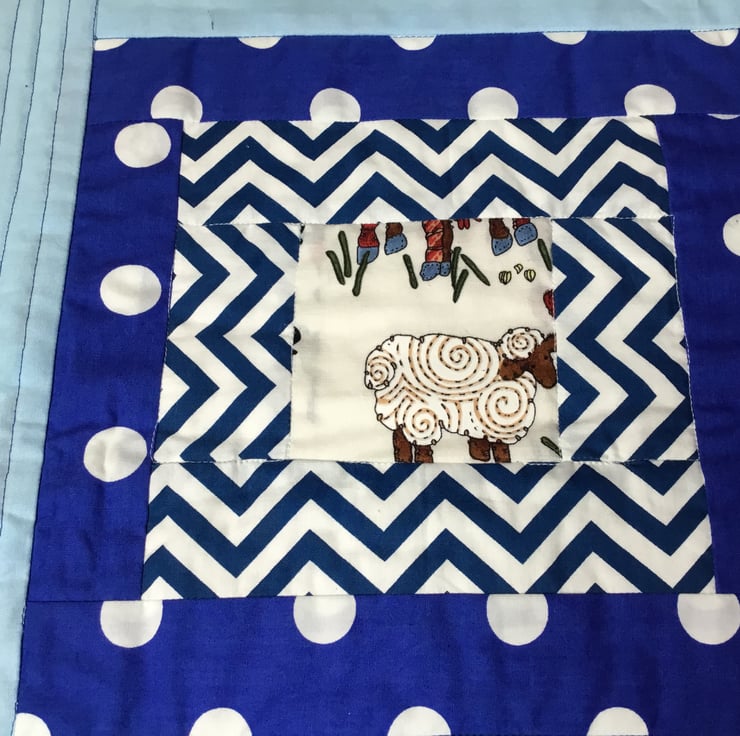 This lovely cot quilt is made from fabrics in various shades of blue in a square design. The top fabrics are all 100% cotton, the back is plain white, brushed cotton and sandwiched between the two is a layer of bamboo wadding. Bamboo is hypoallergenic, beautifully soft and perfect to keep baby warm when it’s cold and cool when it’s hot. The quilt is ideal for the cot, as a play mat or to tuck around the car seat.